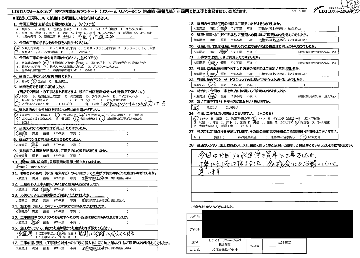 埼玉県三郷市S様邸水栓工事は完了しアンケートをいただきました。