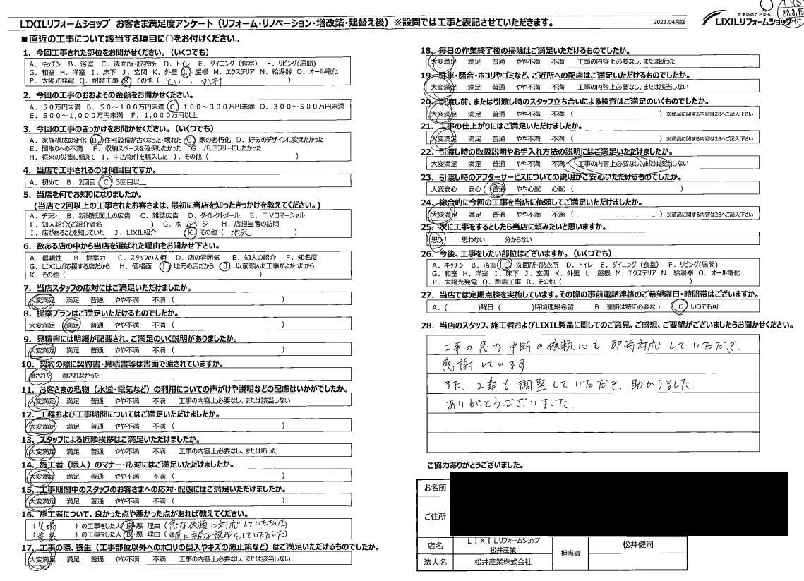 埼玉県三郷市S様邸外壁屋根塗装工事アンケートをいただきました。