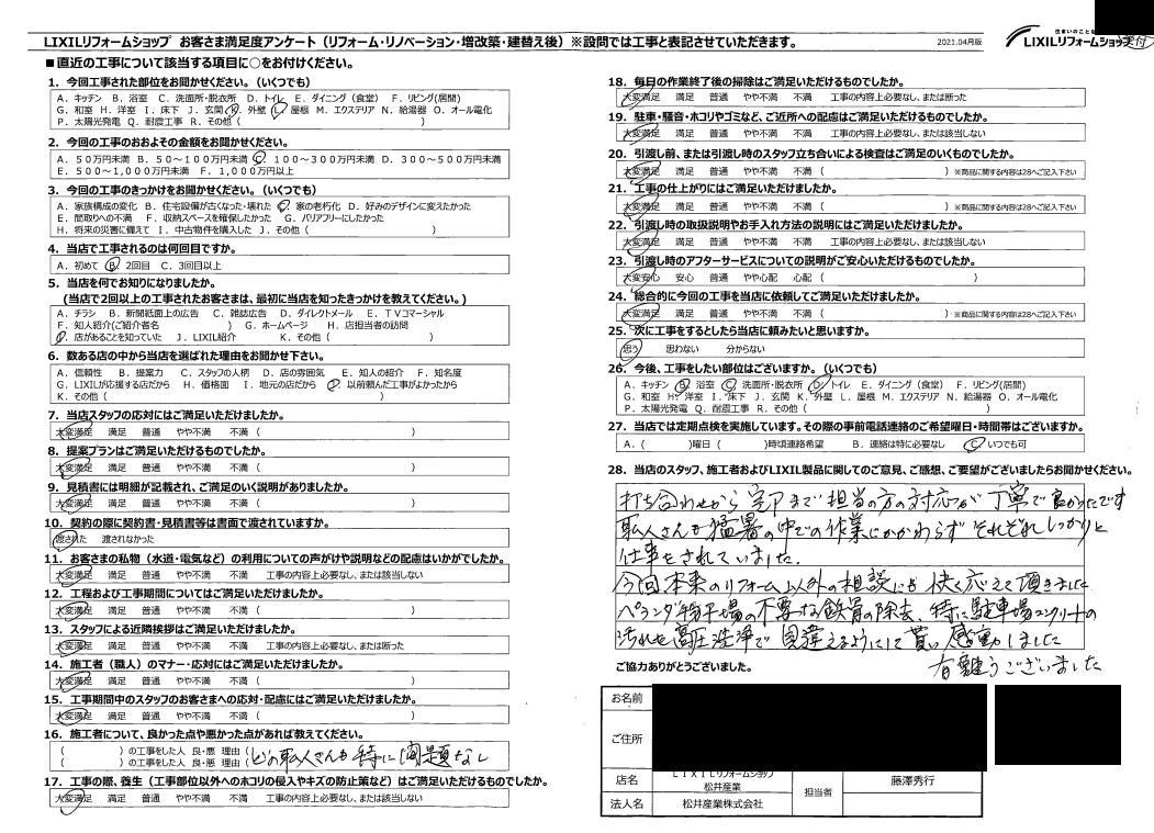 今回本来のリフォーム以外の相談にも快く応えていただきました。ベランダ物干場の不要な鉄骨の除去、特に駐車場コンクリートの汚れを高圧洗浄、見違えるようにしてもらい感動しました。ありがとうございました」