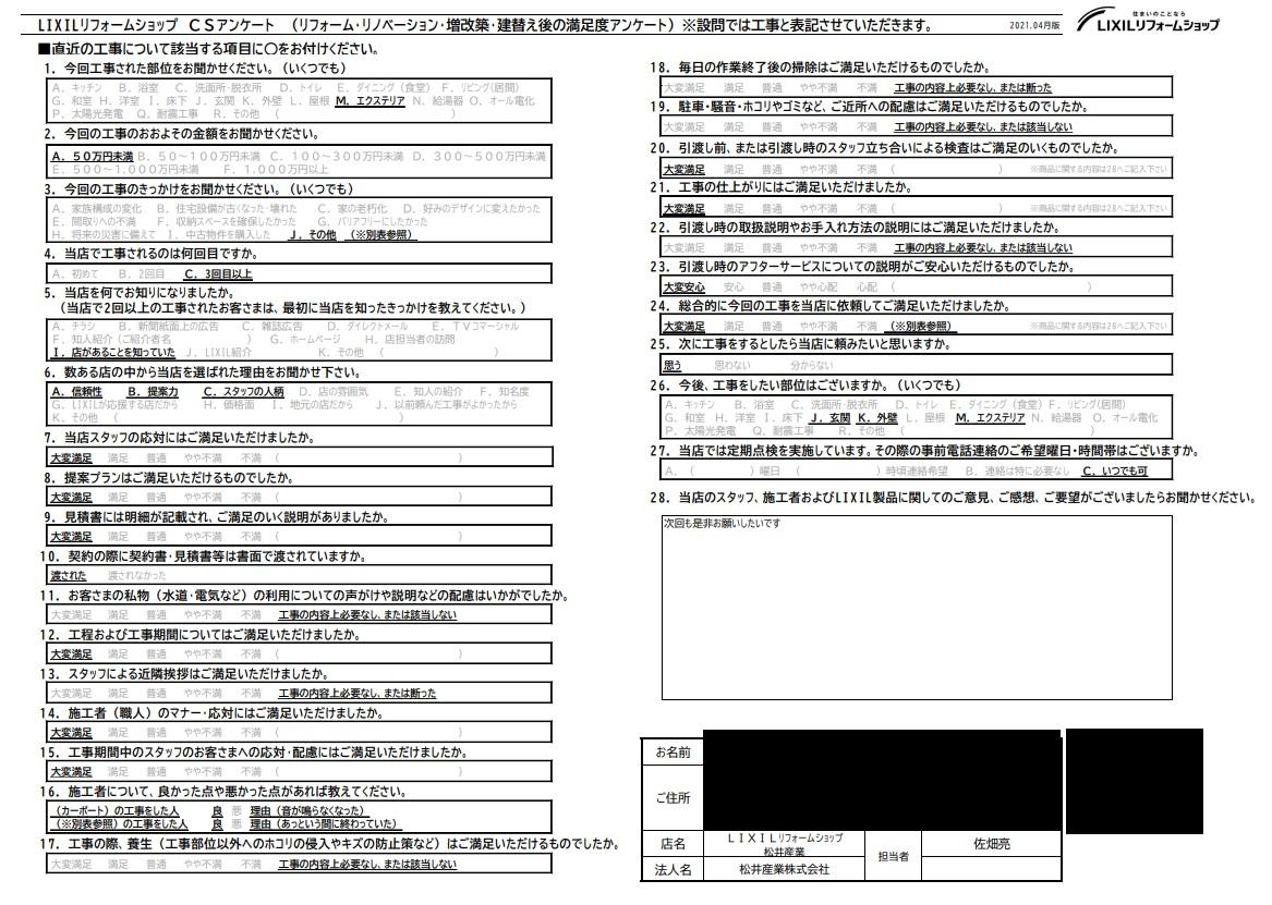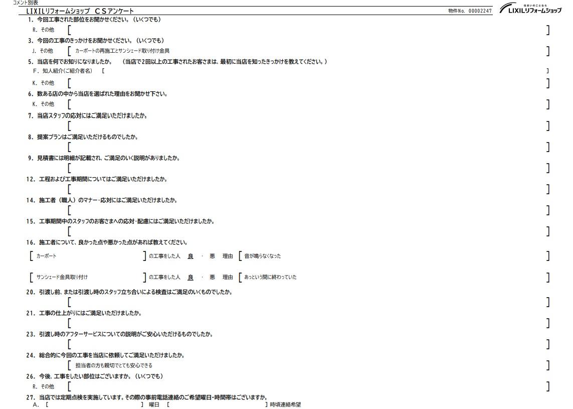 東京都葛飾区M様邸カーポート工事アンケート「またぜひお願いします」