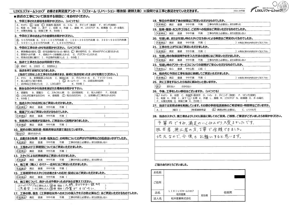 埼玉県草加市O様邸浴室洗面所工事のアンケートをいただきました。