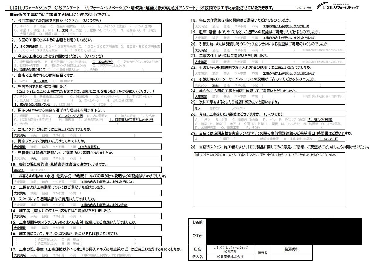 「御社の担当のかた及び施工者とも丁寧な対応をして頂き、安心してお任せすることができました。ありがとうございました」