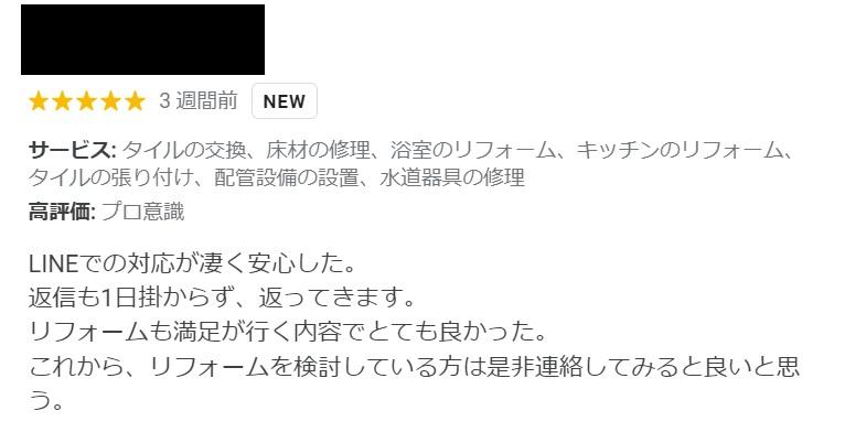 「LINEでの対応が凄く安心した。返信も1日掛からず、返ってきます。リフォームも満足が行く内容でとても良かった。これから、リフォームを検討している方は是非連絡してみると良いと思う。」