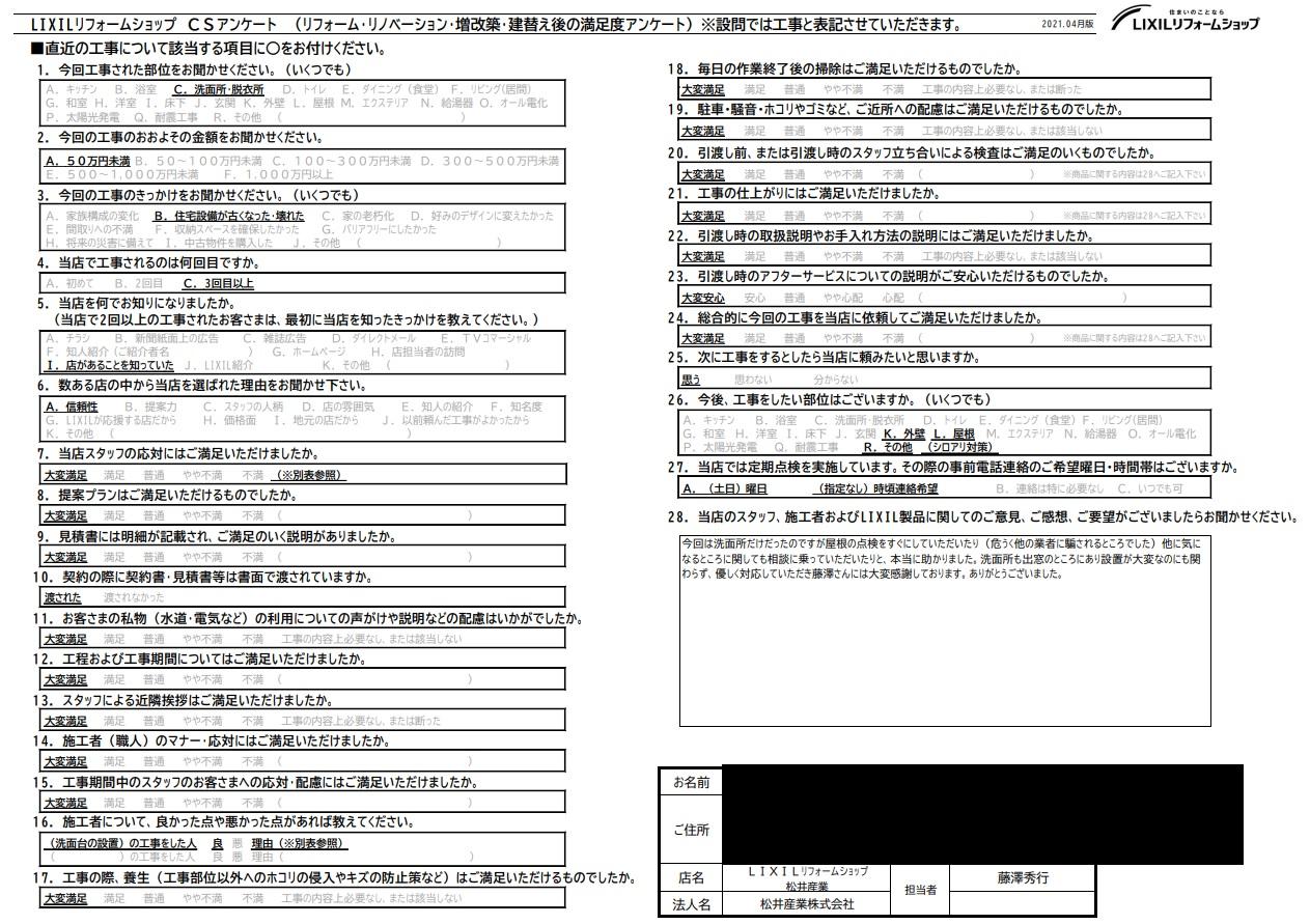 埼玉県三郷市Y様邸洗面化粧台交換工事アンケートをいただきました。