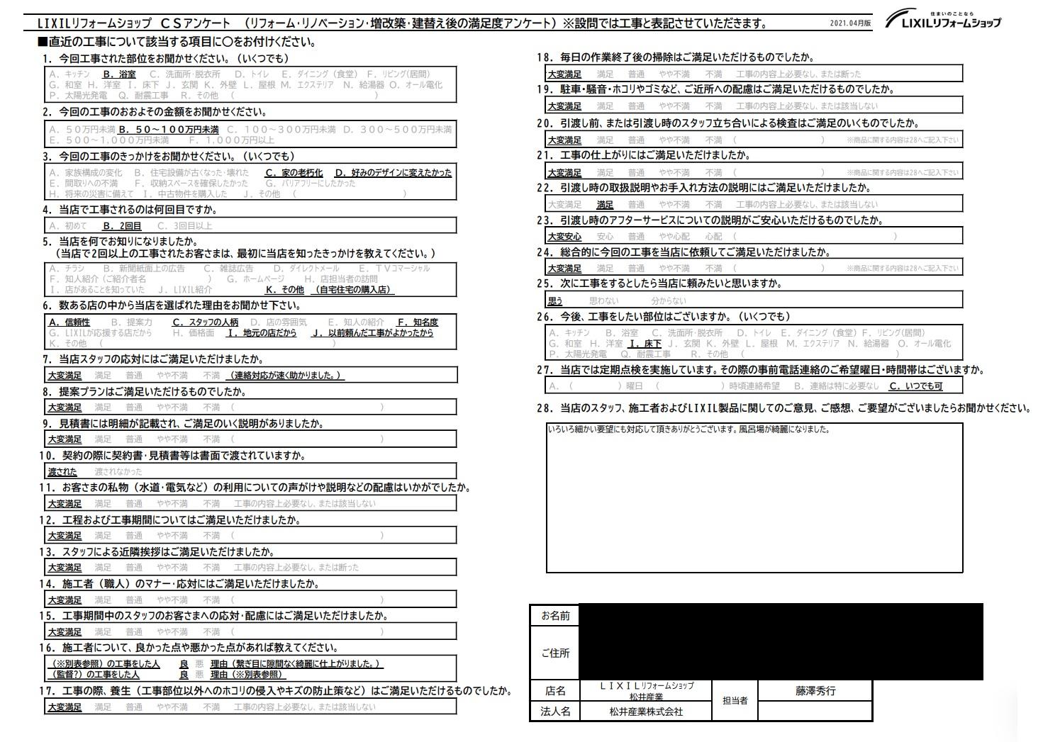埼玉県吉川市K様邸ユニットバス交換工事のアンケート。