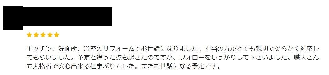 キッチン、洗面所、浴室のリフォームでお世話になりました。担当の方がとても親切で柔らかく対応してもらいました。予定と違った点も起きたのですが、フォローをしっかりして下さいました。職人さんも人格者で安心出来る仕事ぶりでした。またお世話になる予定です。