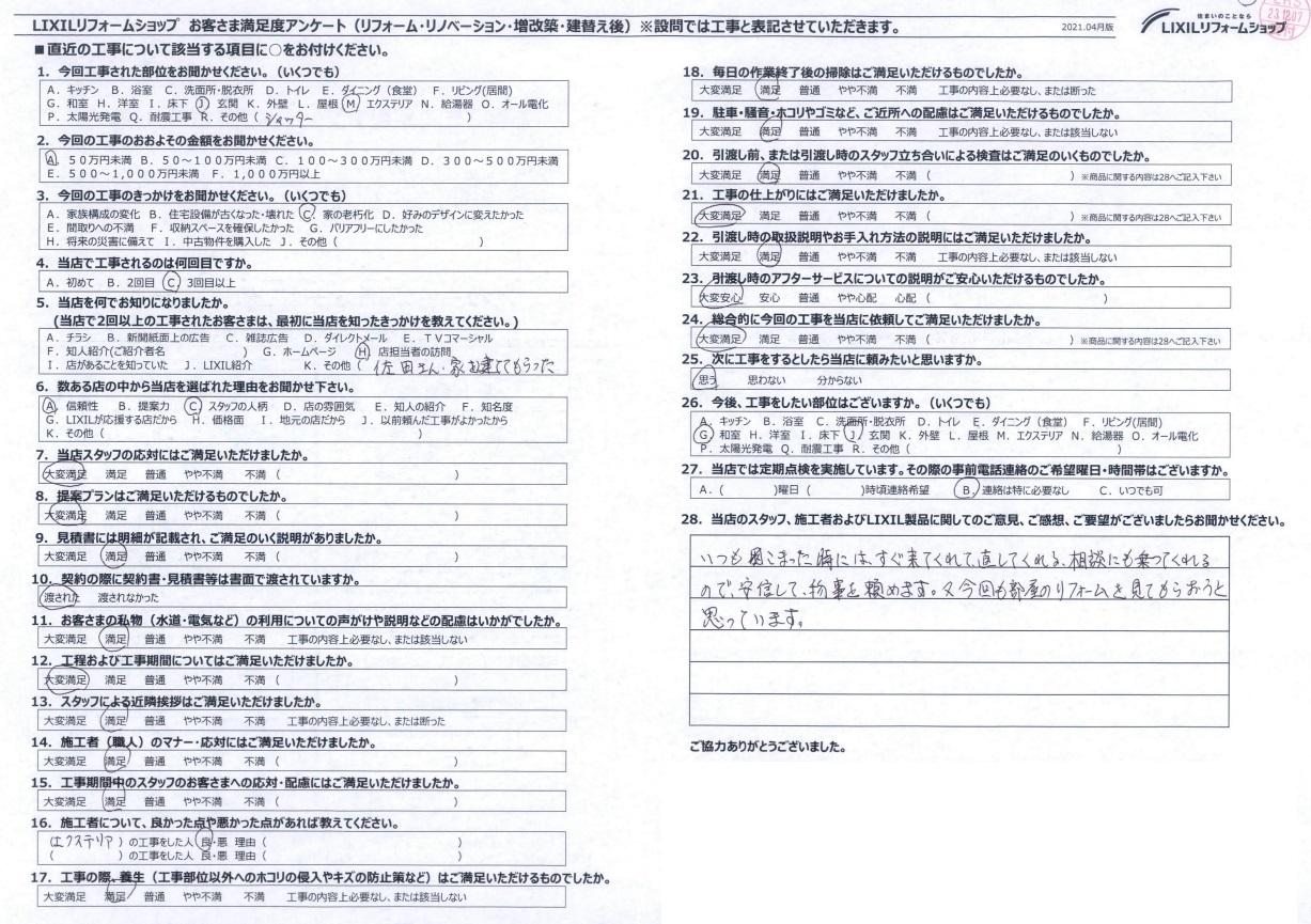 「いつも困った時にはすぐ来てくれて直してくれる。相談にも乗ってくれるので安心して物事を頼めます。また今回も部屋のリフォームを見てもらおうと思っています」