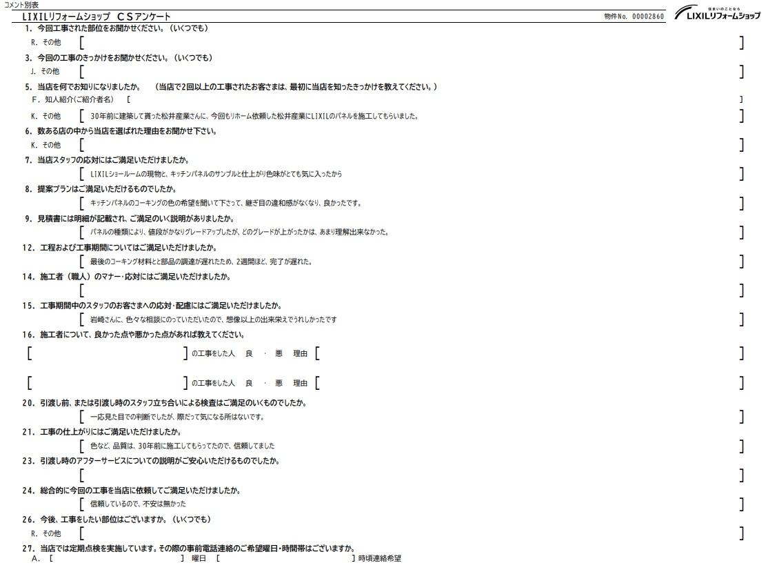 「キッチンパネルの接続部分のコーキングが、より、違和感が無い自然の色味のコーキング材を選べるようにして欲しいです。できれば、キッチンパネルがマグネット付きになったら、最高です」「岩崎さんに、色々な相談にのっていただいたので、想像以上の出来栄えでうれしかったです」「色など、品質は、30年前に施工してもらってたので、信頼してました」「信頼しているので、不安は無かった」などのお喜びのお言葉をいただきました。