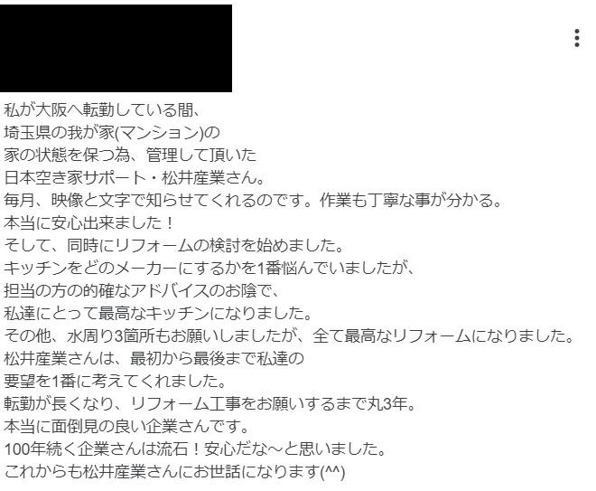 「私が大阪へ転勤している間、埼玉県の我が家(マンション)の家の状態を保つ為、管理して頂いた日本空き家サポート・松井産業さん。毎月、映像と文字で知らせてくれるのです。作業も丁寧な事が分かる。本当に安心出来ました。そして、同時にリフォームの検討を始めました。キッチンをどのメーカーにするかを1番悩んでいましたが担当の方の的確なアドバイスのお陰で、私達にとって最高なキッチンになりました。その他、水周り3箇所もお願いしましたが、全て最高なリフォームになりました。松井産業さんは、最初から最後まで私達の要望を1番に考えてくれました。転勤が長くなり、リフォーム工事をお願いするまで丸3年。本当に面倒見の良い企業さんです。100年続く企業さんは流石!安心だな〜と思いました。これからも松井産業さんにお世話になります」