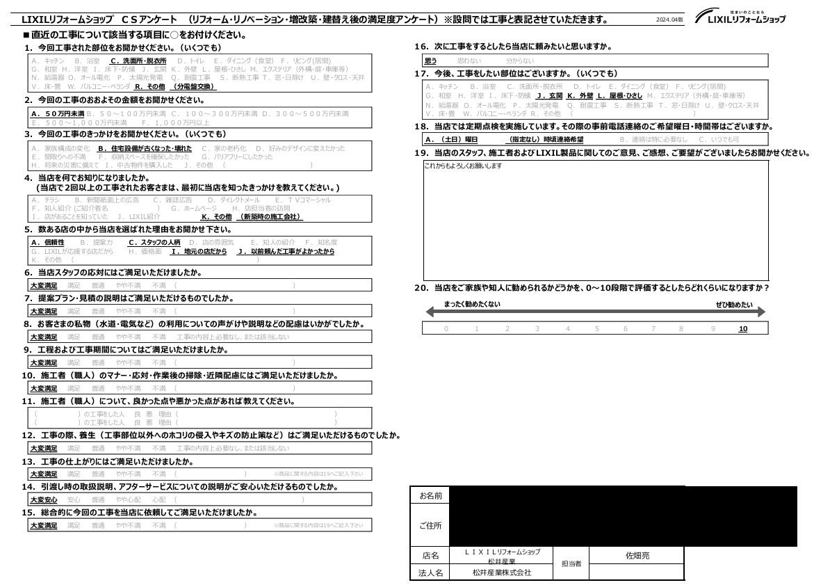 埼玉県吉川市K様邸分電盤工事のアンケートです。