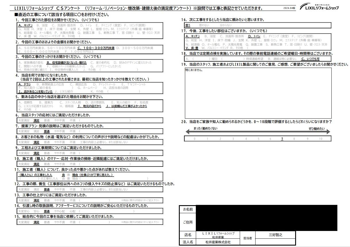 埼玉県三郷市M様邸キッチン交換工事アンケートです。
