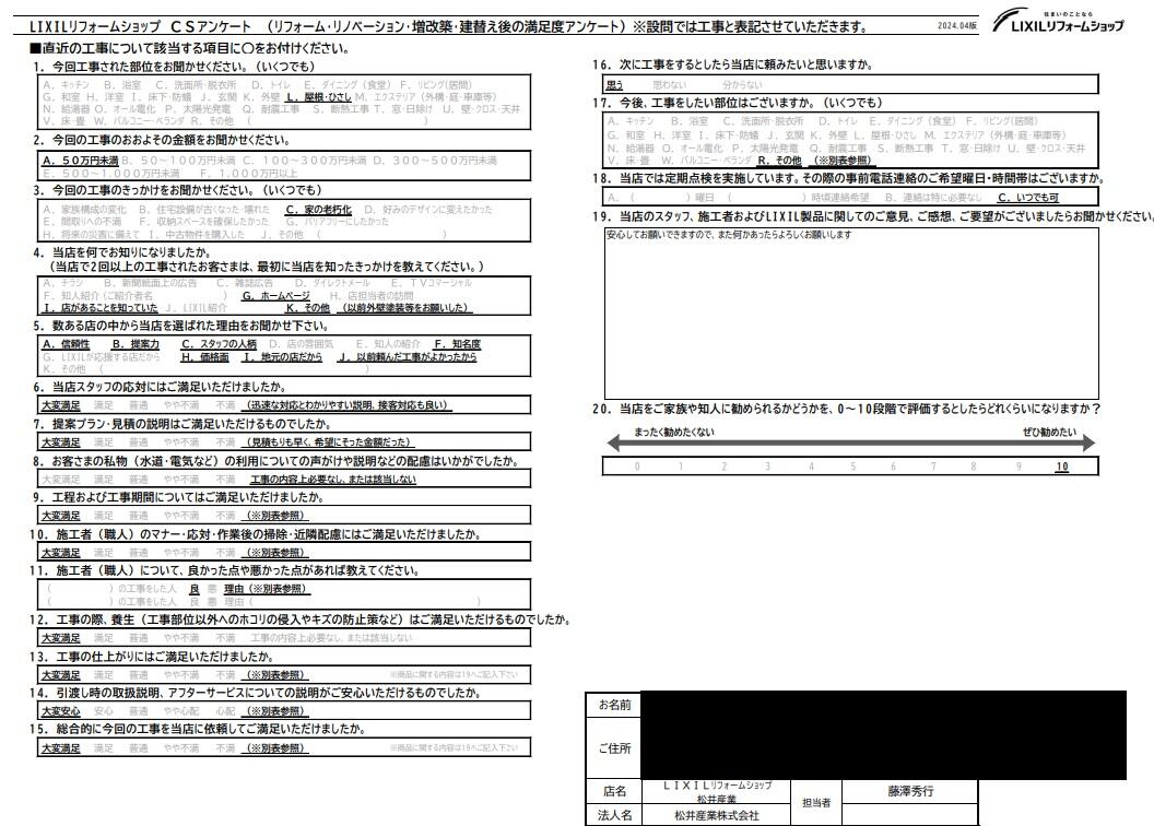 埼玉県三郷市A様邸屋根庇工事アンケートをいただきました。