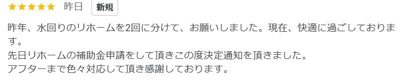 「昨年、水回りのリホームを2回に分けて、お願いしました。現在、快適に過ごしております。先日リホームの補助金申請をして頂きこの度決定通知を頂きました。アフターまで色々対応して頂き感謝しております」