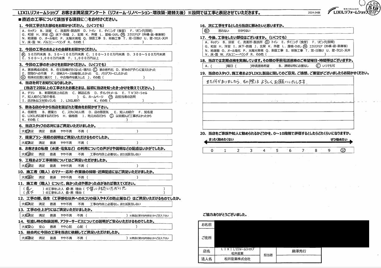 埼玉県越谷市S様床・防蟻工事が完了しアンケートをいただきました。「また何かありましたらその際はよろしくお願いします」
