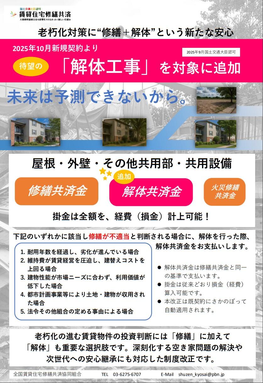 この度、国土交通大臣の認可を受け、2025年10月の新規契約より、これまでの修繕共済に加えて「解体工事」が新たに対象に含まれることになりました。