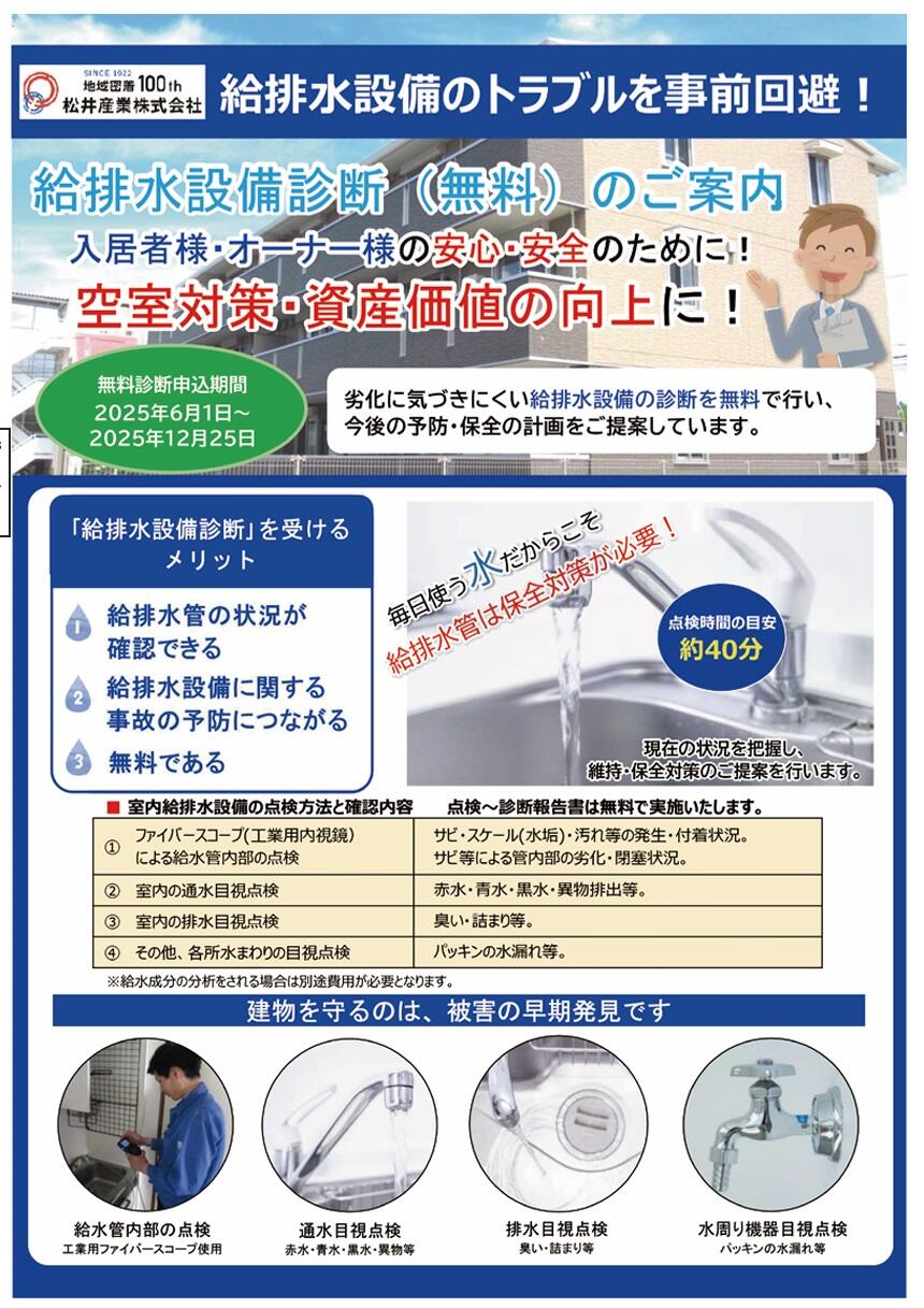 一覧へ戻る埼玉県三郷市吉川市の賃貸オーナー様向けに給排水管の無料点検をお勧めしています。