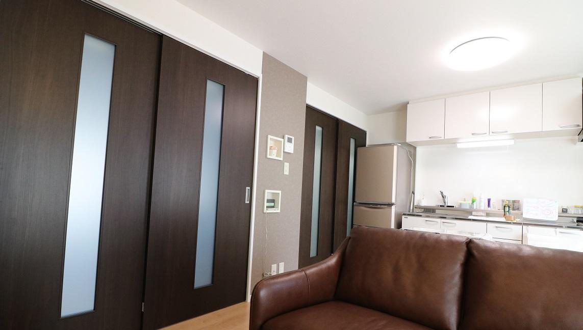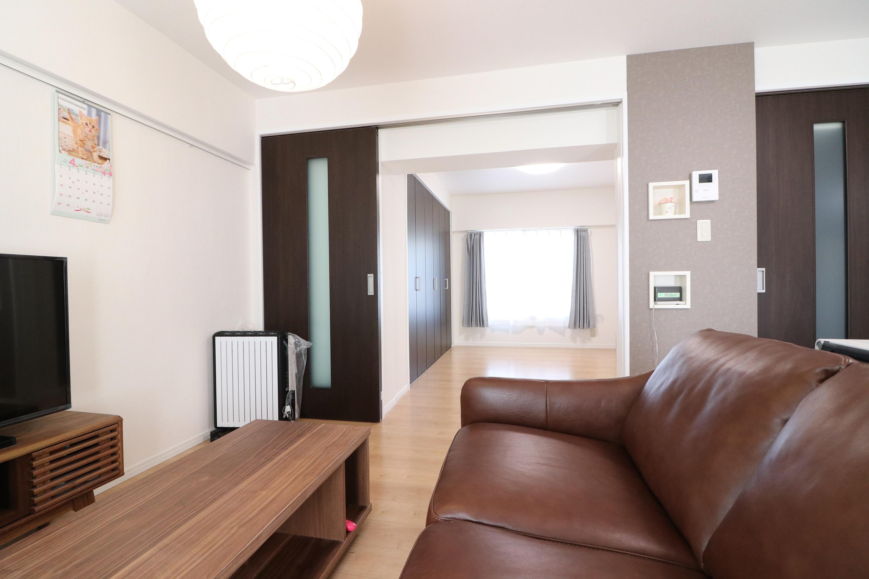 間取りは3DKから2LDKへ、床はフルフラットのフローリングとしました。間仕切り戸も開口部が大きく、滑らかに動く吊り戸としたので、床にレールなどはありません。サッシは既存の窓枠を残しながらそれをカバーするように取り付ける「カバー工法」でペアガラスに。暖かく、ヒートショックや結露対策にもなります。「室内の段差がなくなり、安心感をもって動き回ることができる。イメージ以上に綺麗になって、新築みたい」と、笑顔で話されるお二人が印象に残るリノベーション工事となりました。