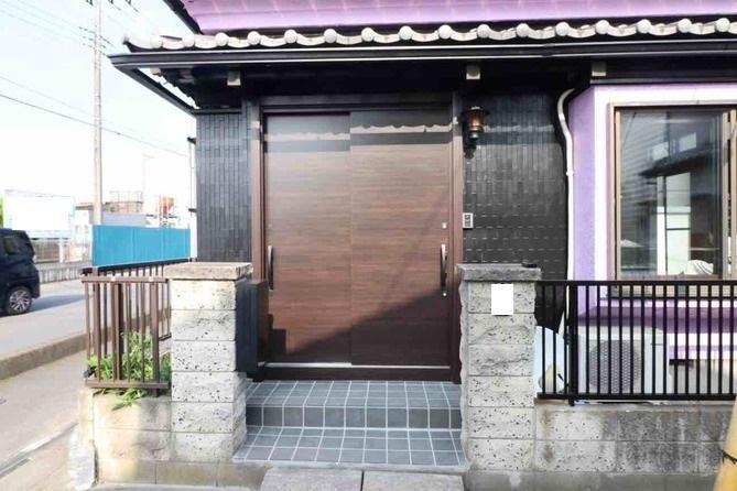 埼玉県三郷市O様邸玄関引戸交換工事です。 LIXIL リシェント 玄関引戸 P03型 手動キー クリエダーク/欄間付き 取付施工費 既存処分費含む