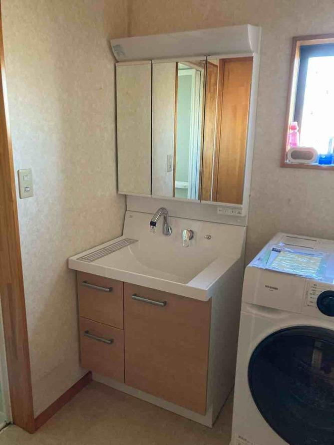 埼玉県三郷市S様邸洗面化粧台交換工事が完了しました。 LIXIL ピアラ W750 洗面化粧台 ミラーキャビネット3面鏡 止水栓 交換施工