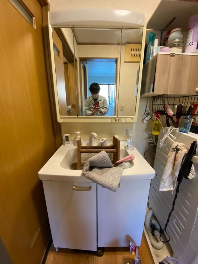 埼玉県三郷市S様邸は洗面化粧台交換工事です。 LIXILエスタ エスタ木枠ミラー クリエダーク 標準工事費 解体~配管~組立 LIXILピアラ吊り戸 クリエダーク 下地ベニヤ 洗濯パン撤去 直排水切り替え