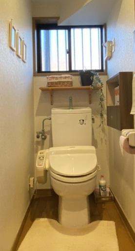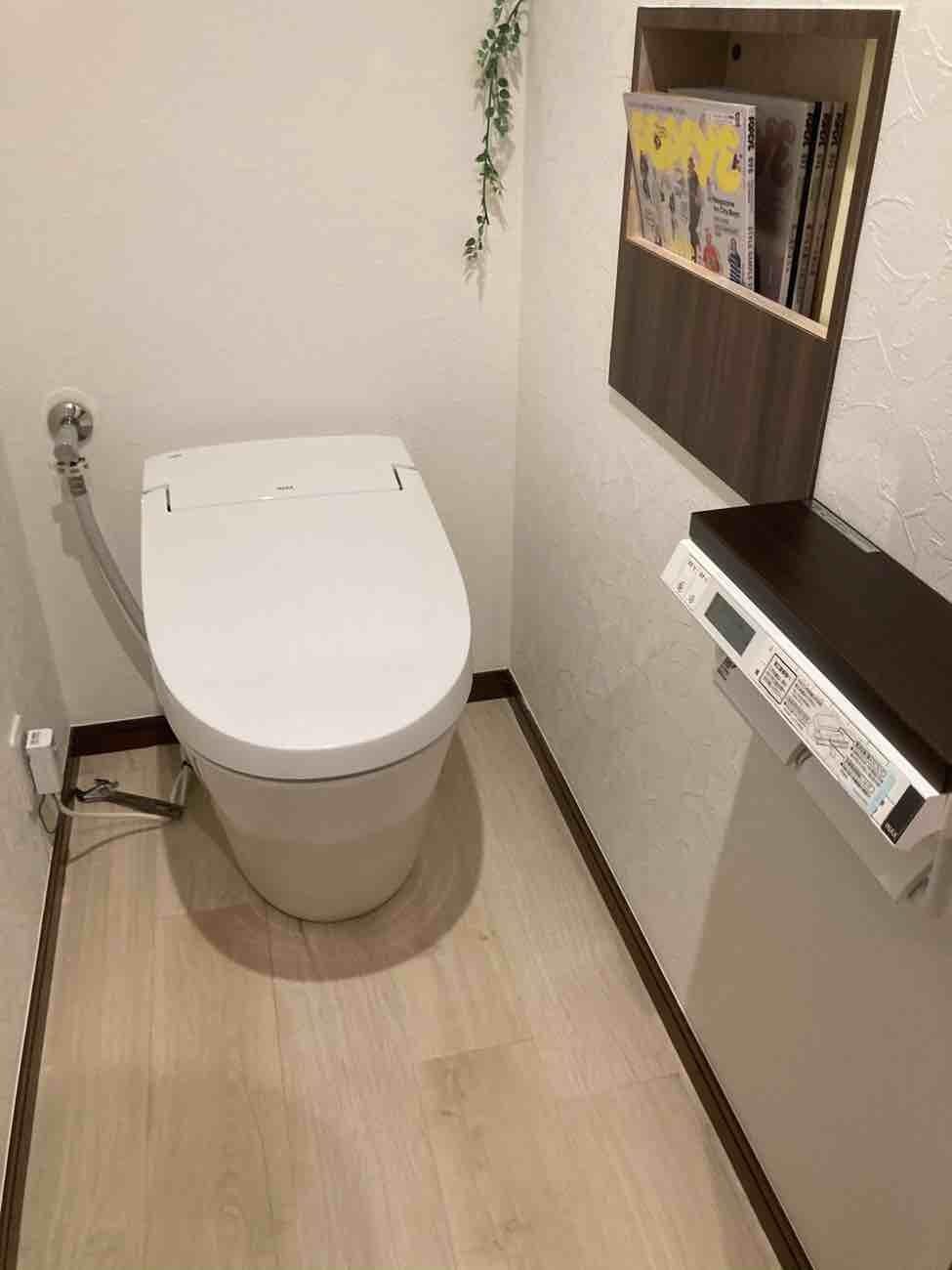 埼玉県三郷市S様邸はトイレ交換が完了しました。 LIXILサティスS ホワイト 便器 機能部 壁リモコン フタ開閉手動 フランジ(排水接続部材) 棚付2連紙巻 クリエダーク 交換基本施工