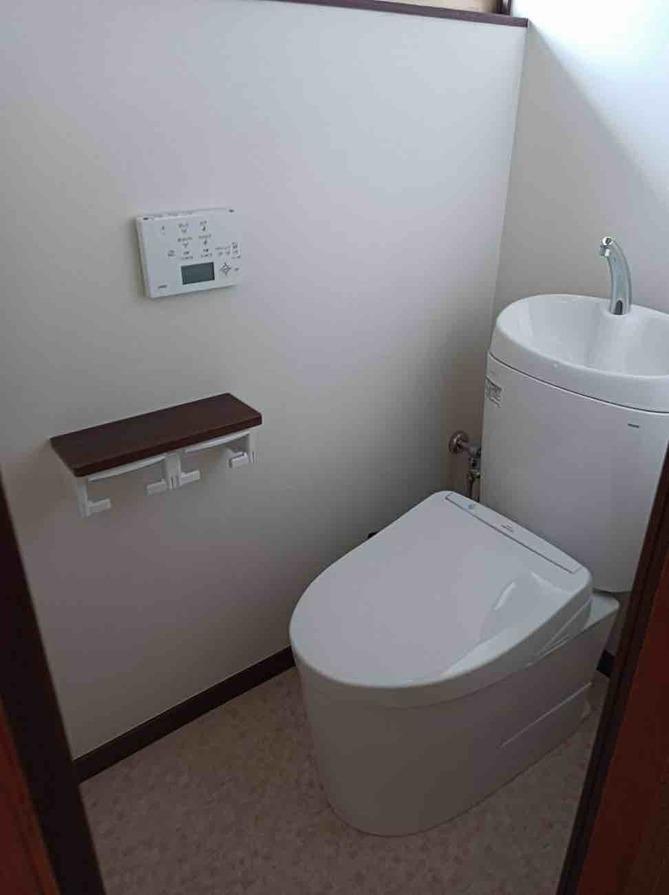 埼玉県三郷市S様邸トイレ交換工事が完了しました。 TOTOピュアレストEX 本体 手洗い付き密結タンクピュアレスト 便座 アプリコット 標準工事費 撤去~非便管~便器組立 雑材消耗品 ペーパーホルダー(ブラウン) タオルリング(ブラウン) 内装工事
