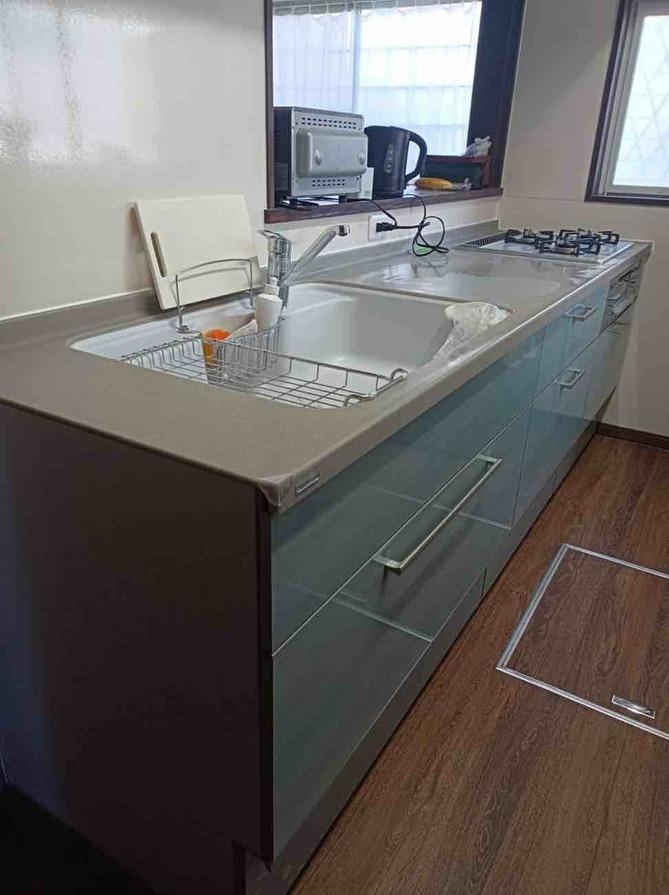 埼玉県三郷市S様邸キッチン交換工事が完了しました。 システムキッチン トクラスBb W2550 本体カームブルー 人大カウンター キッチン組立 パネル設置 電動昇降水切り 設置 解体 配管 木工事 処分 L型→I型 壁補修他大工 コンセント移設新設 天井照明 LED交換 材工 コンロ前スクリーン