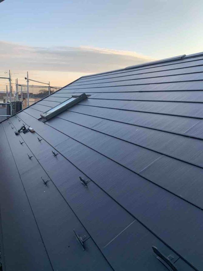 屋根平葺 ニチハ 横暖ルーフS 79.4㎡ 下葺ルーフィング 23㎏ 79.4㎡ 軒先捨唐草 ガルバリウム0.35改修用 24.2m ケラバ包み ガルバリウム0.35 17.0m 捨谷 ガルバリウム0.35 2.6m 棟包み ガルバリウム0.35 11.9m 換気棟 2P 1ヶ所 雪止 50本 既存役物撤去 28.9m