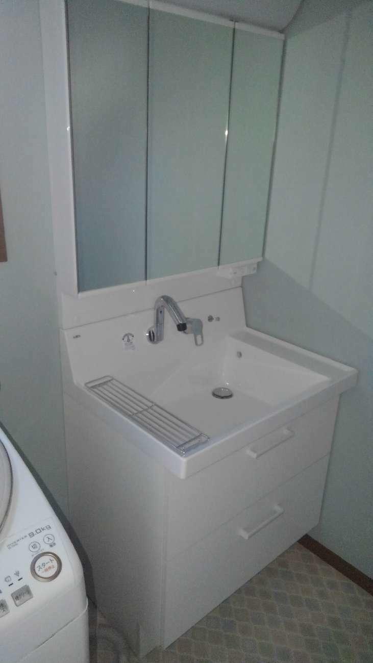 埼玉県三郷市S様邸洗面化粧台交換工事が完了しました。 LIXIL ピアラ 化粧台本体 w750 フルスライド引き出し ホワイト ミラーキャビ 3面鏡 裏全収納 曇り止めなし 脱着施工 給配管 処分込