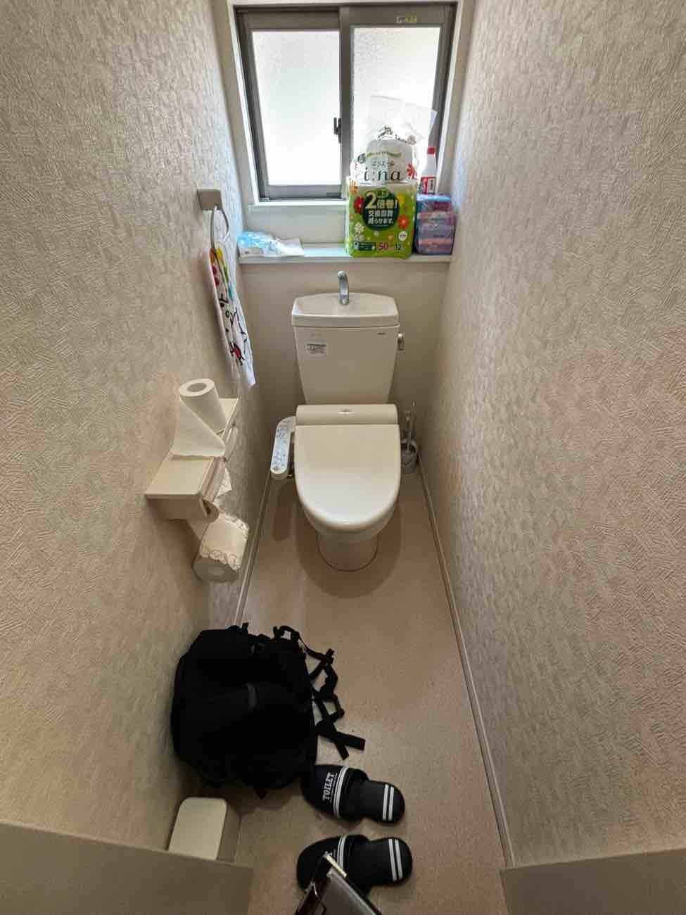 埼玉県吉川市M様邸トイレ交換工事が完了しました。 TOTO ピュアレストQR 便器本体部 手洗い付きタンク ウォシュレットSB 交換施工 養生 玄関 廊下 トイレ内