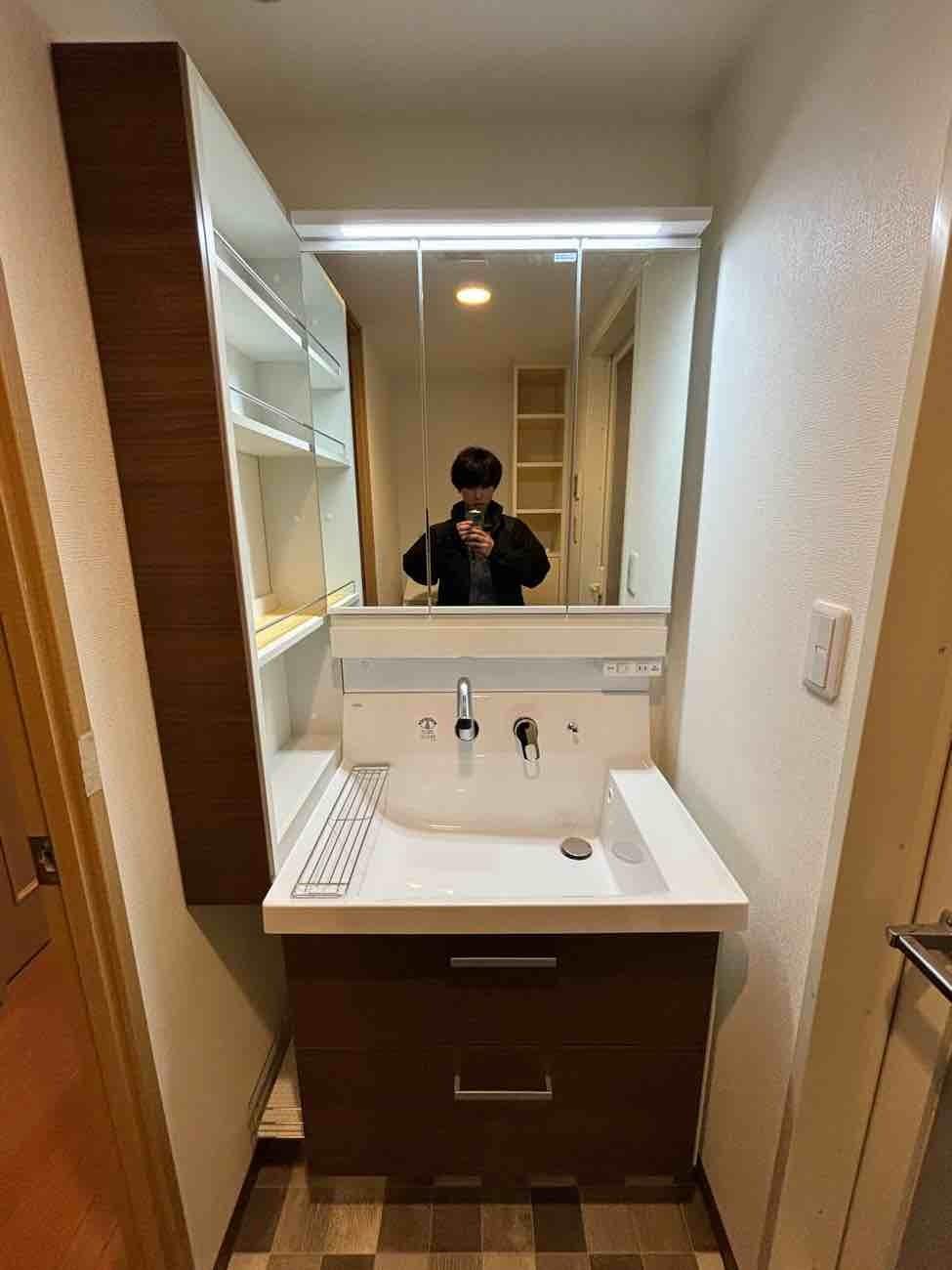 埼玉県三郷市S様邸マンション洗面化粧台交換工事 リクシルLIXIL ピアラ 間口 750mm 化粧台本体 ミラーキャビネット 止水栓 トールキャビネット 交換施工