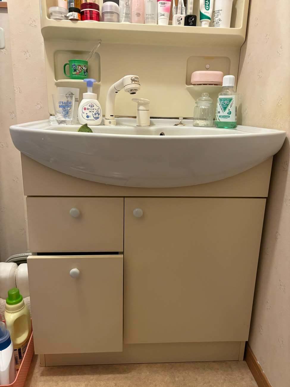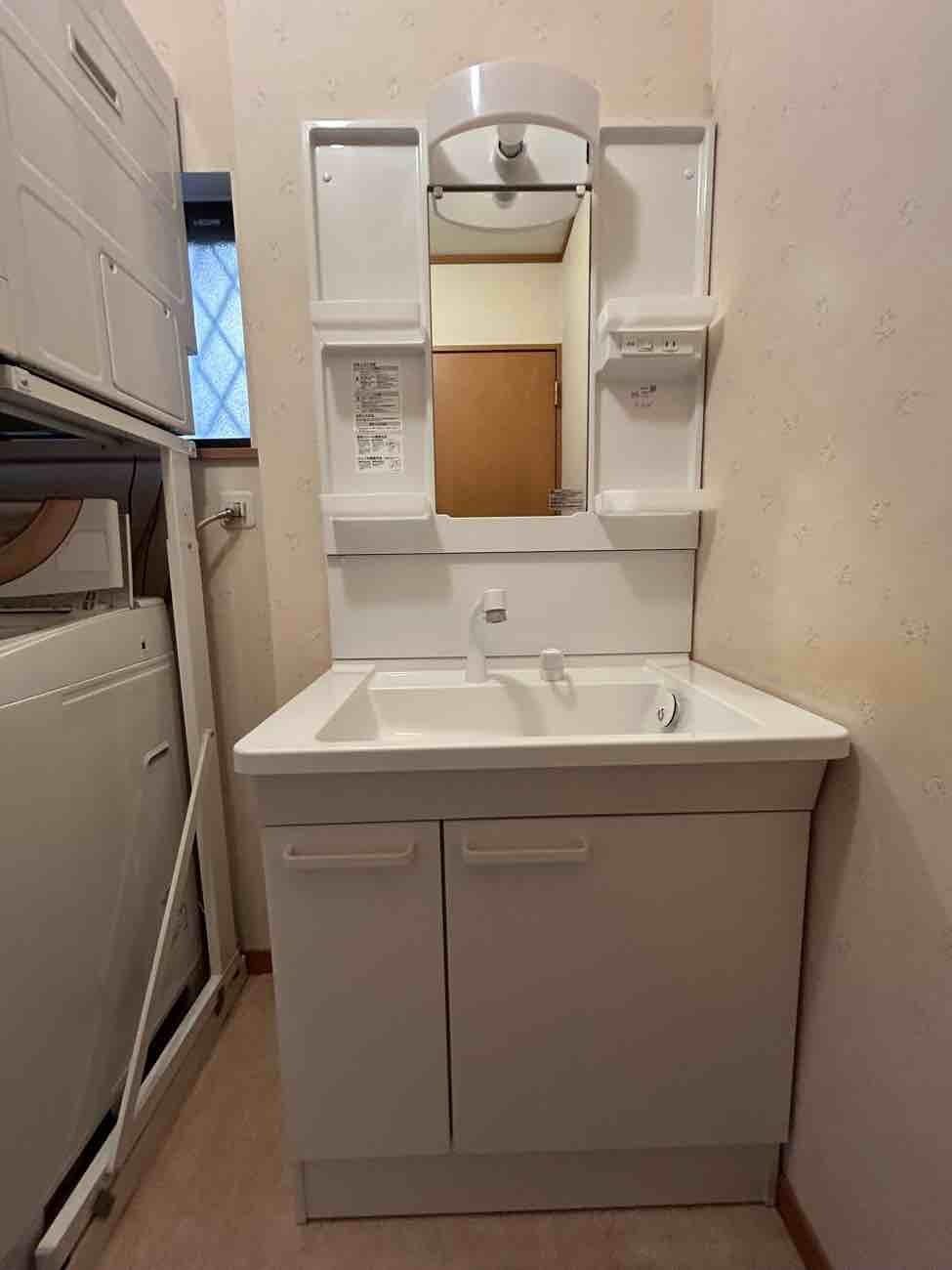 埼玉県北葛飾郡松伏町T様邸洗面化粧台交換工事が完了しました。 TOTO Vシリーズ 化粧台本体 ミラーキャビネット 止水栓 交換施工 処分