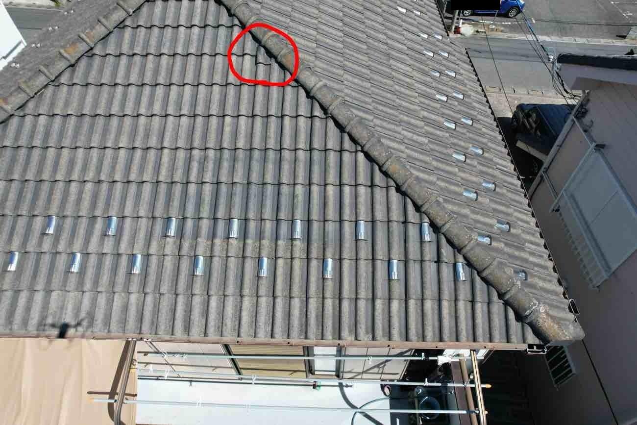 埼玉県三郷市I様邸雨漏れドローン調査、補修工事を行いました。埼玉県三郷市I様より2階寝室の雨漏れでお困りとのご連絡をいただきました。雨漏れの位置から屋根を見てみようとドローンを飛ばして様子を見てみました。南側の隅棟近辺、瓦が割れているような場所がありました。2階寝室、吹き込むような風の時に雨漏れがするというお話でした。位置から考えると壁際よりも風が強い時にこの部分から雨が入っている可能性が高いため職人に写真を見てもらい応急処置をしていただきました。様子を見ていただければと思います。