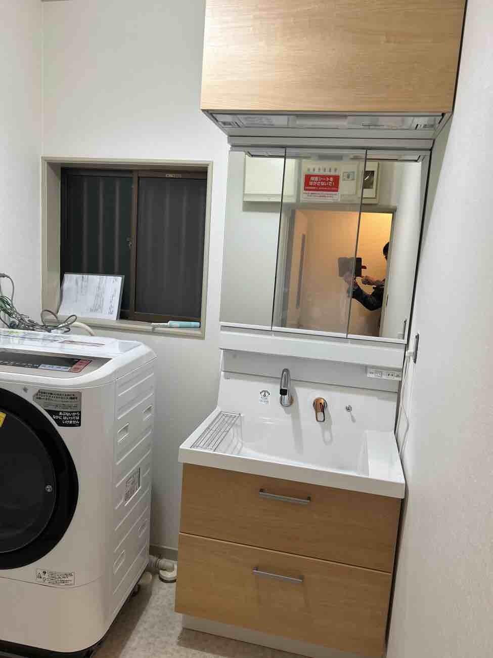 埼玉県三郷市N様邸洗面化粧台交換工事が完了しました。 LIXIL ピアラ W750 面材色 LP2H 化粧台本体 フルスライド引き出し ミラーキャビ 吊り戸ダウン機能 壁下地ベニヤ入れ 脱着施工 給配管 処分 洗濯水栓交換 LIXIL 洗面所セラミック暖房 マックス社