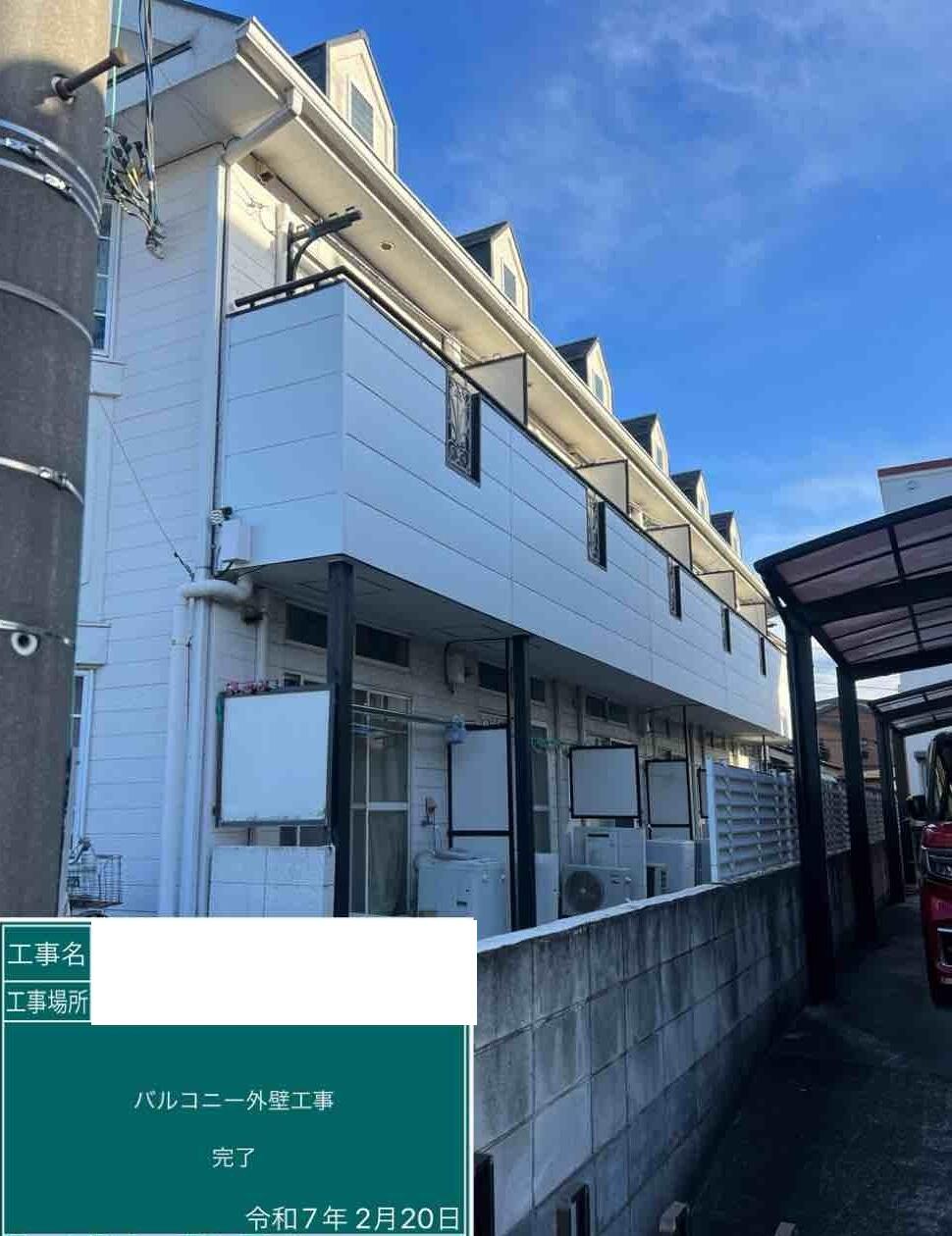 埼玉県吉川市K様邸バルコニー外壁補修軒天補修工事が完了しました。 バルコニーから水が入り軒天部分が腐食していました。軒天部分外壁部分を解体して原因調査後に原因となる笠木部分、開口部部分を補修をしました。