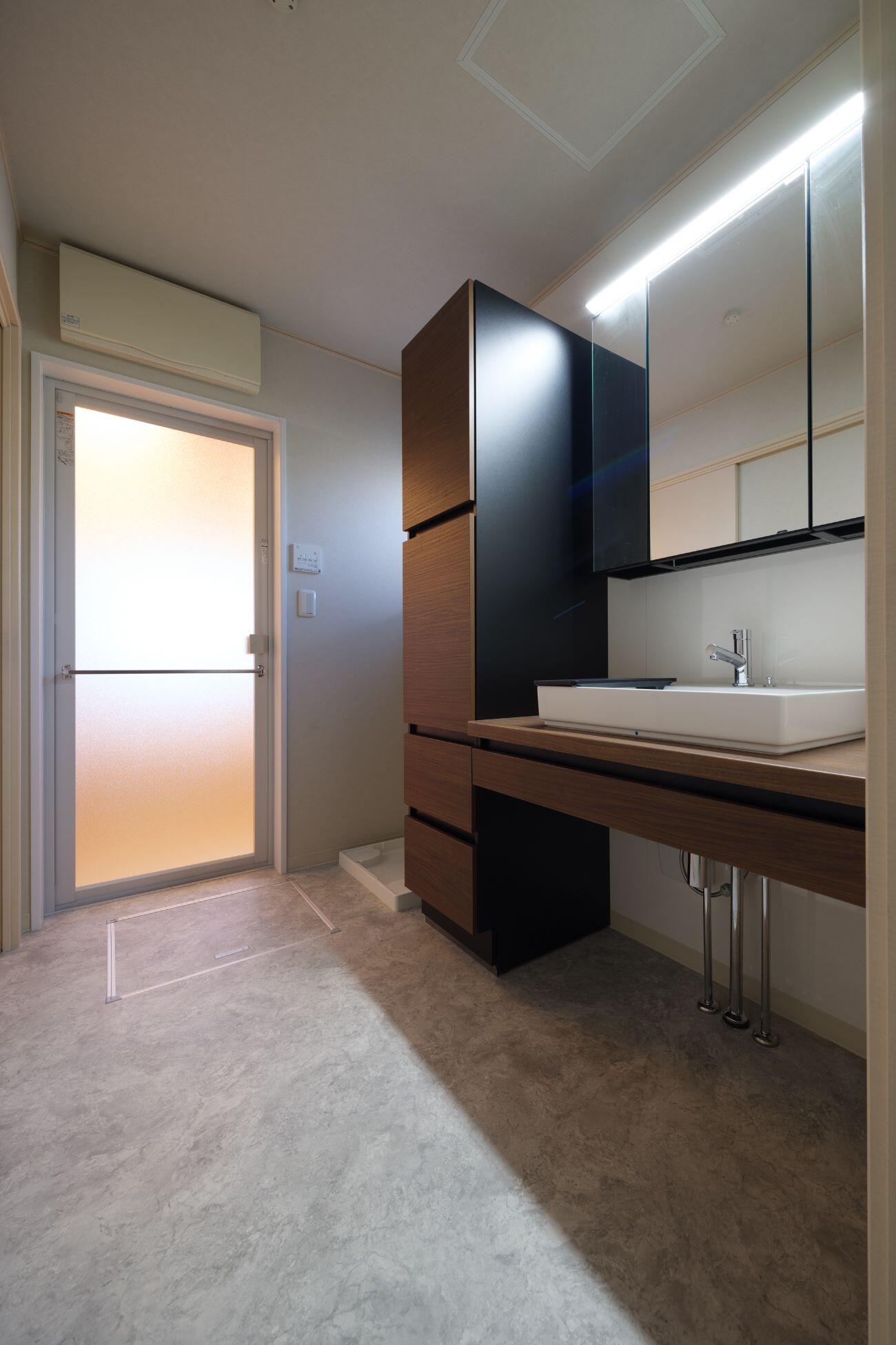 空間の印象を大きく左右する床材には、デザイン性と耐水性に優れたクッションフロアを採用しました。今回は約6mを使用し、シックなグレーの石目調デザインを選択。ダークブラウンのキャビネットと相まって、空間全体を引き締めています。