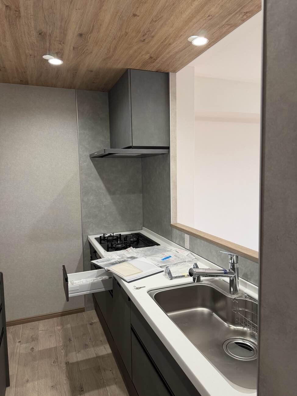 この度は工事をお任せいただき、ありがとうございました。 以前の白いキッチンも清潔感がありましたが、今回のリフォームでガラッと雰囲気が変わりましたね。クリナップ「ラクエラ」のシックなグレーと、天井の木目調クロスとの組み合わせが本当に素敵で、まるでカフェのような空間に仕上がったと思います。 照明もダウンライトですっきりとさせたことで、L2600というワイドサイズのキッチンの存在感がより際立ちました。新しくなったキッチンで、素敵な時間をお過ごしください。
