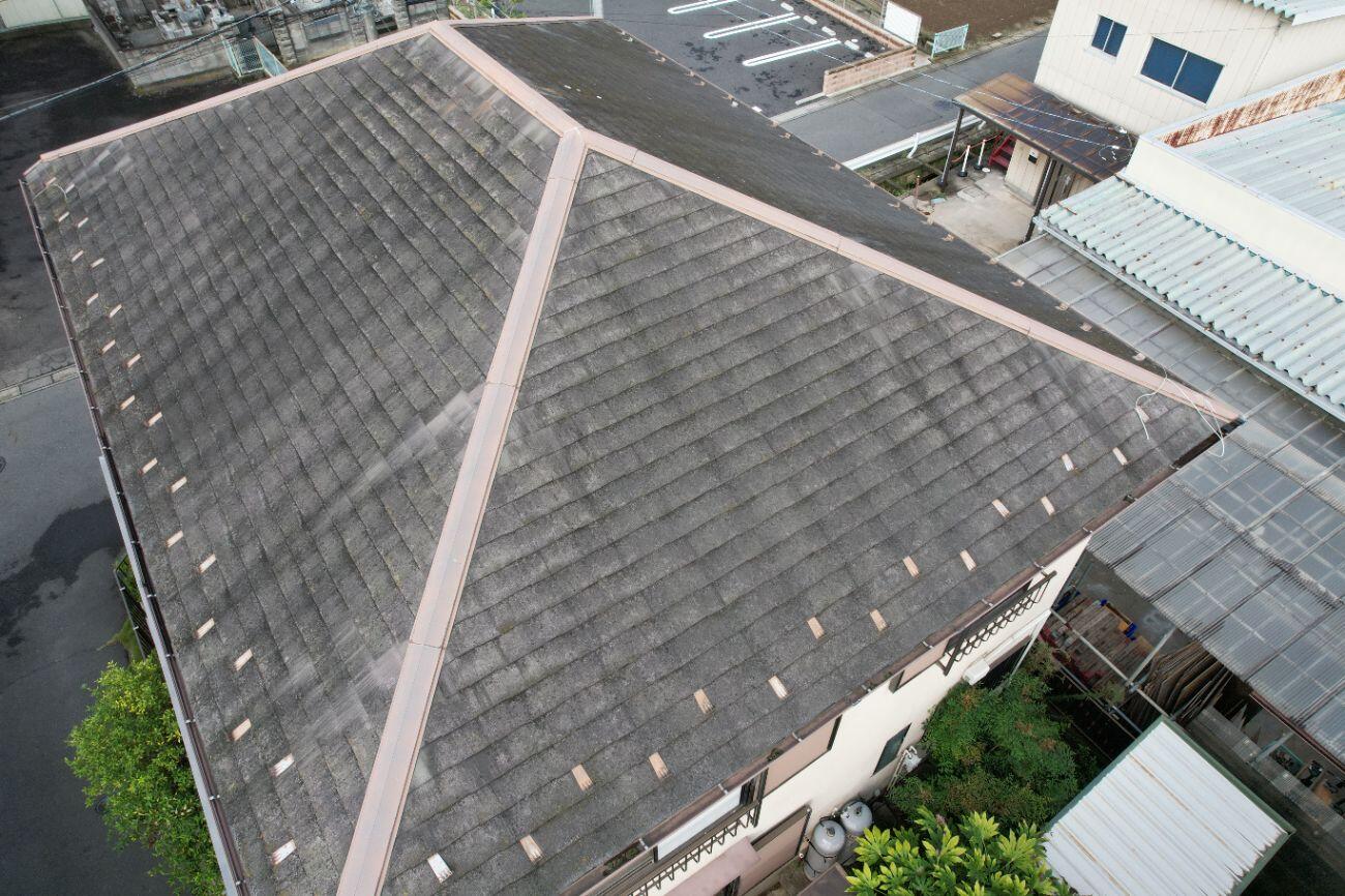 施工前のスレート屋根は、全体的な色褪せや苔の発生が見受けられ、防水機能の低下が心配される状態でした。今回は、デザイン性と機能性を兼ね備えた「スーパーガルテクト」をご提案させていただきました。 特にこだわったのは、強風対策です。見えなくなる下地部分に、腐食しない樹脂製「タフモック」を使用することで、台風シーズンも安心してお過ごしいただける屋根に仕上げています。ブラウンの屋根が建物全体を上品に引き締め、新築のような美観を取り戻しました。