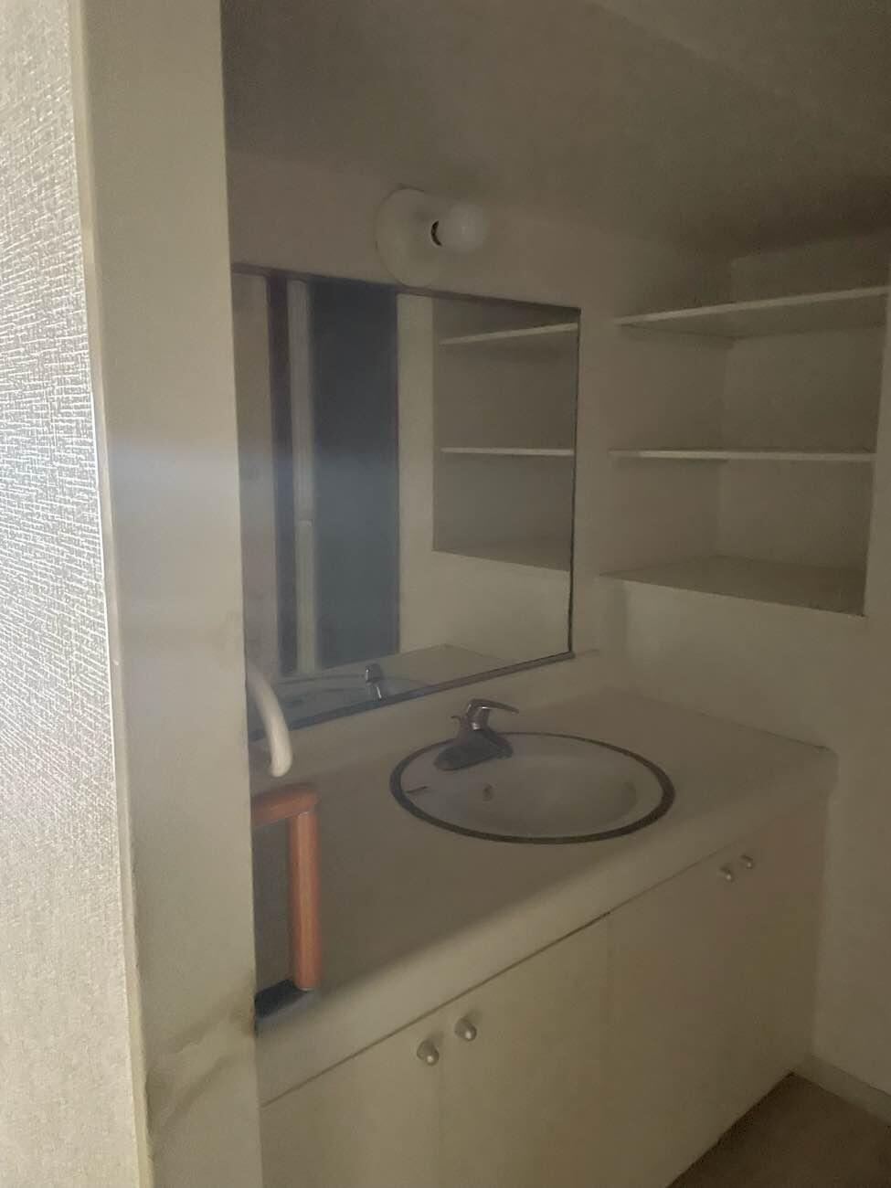 ▼ Before 以前は、一般的な規格サイズの洗面化粧台をご使用でした。清潔感のあるホワイトでしたが、収納量の不足や、鏡まわりの使い勝手、そして長年の使用による経年劣化がお悩みでした。