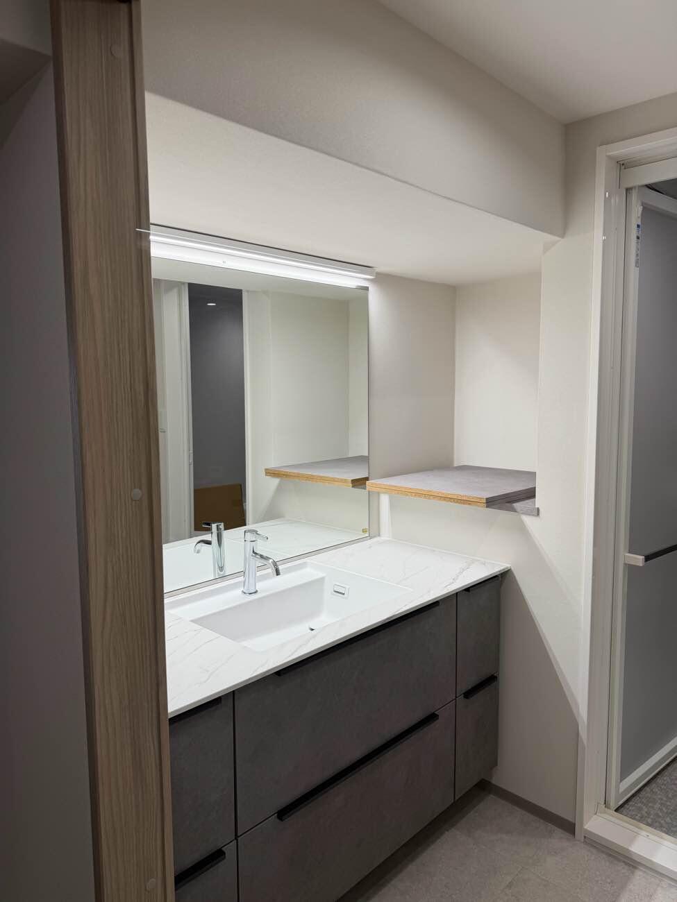 既製のキャビネット付きミラーは使用せず、あえて特注の一枚鏡をオーダーしました。 壁の端から端まで広がる鏡は、視覚的な奥行きを生み出し、空間を広く見せる効果抜群です。余計なフレームを排除することで、ミニマルで美しい仕上がりとなりました。
