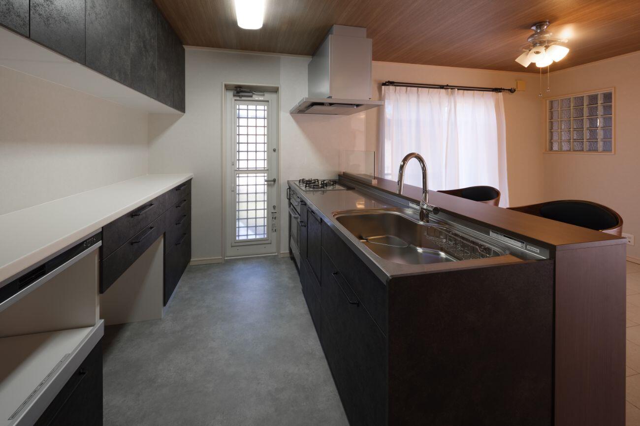新しく設置したのは、意匠性に優れた対面式キッチン。キッチンの面材をダークトーンの石目調に統一し、天井の木目クロスやグレーの床タイルと合わせることで、まるで高級ホテルのようなモダンな空間に生まれ変わりました。
