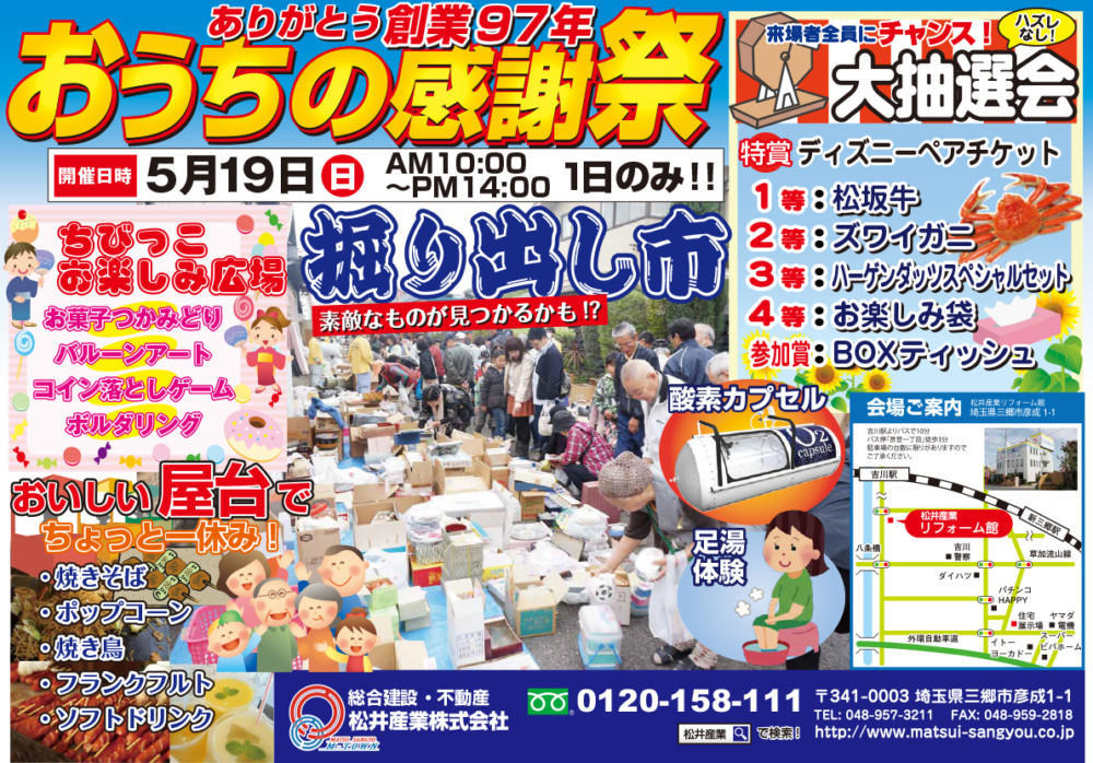 さて、5月19日(日)のお出かけ先におすすめなのが、松井産業本社で開催される「掘り出し市&おうちの感謝祭」。