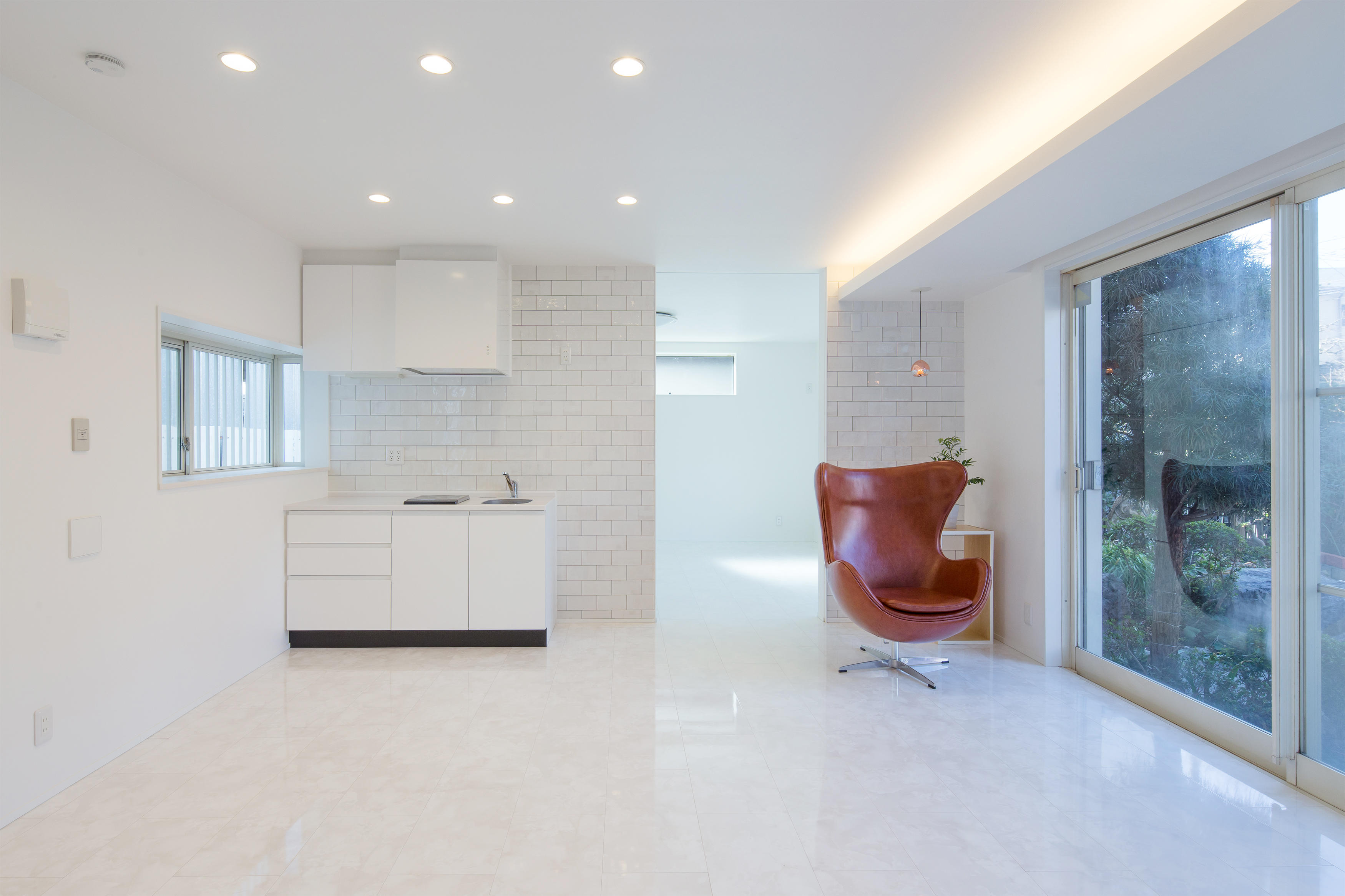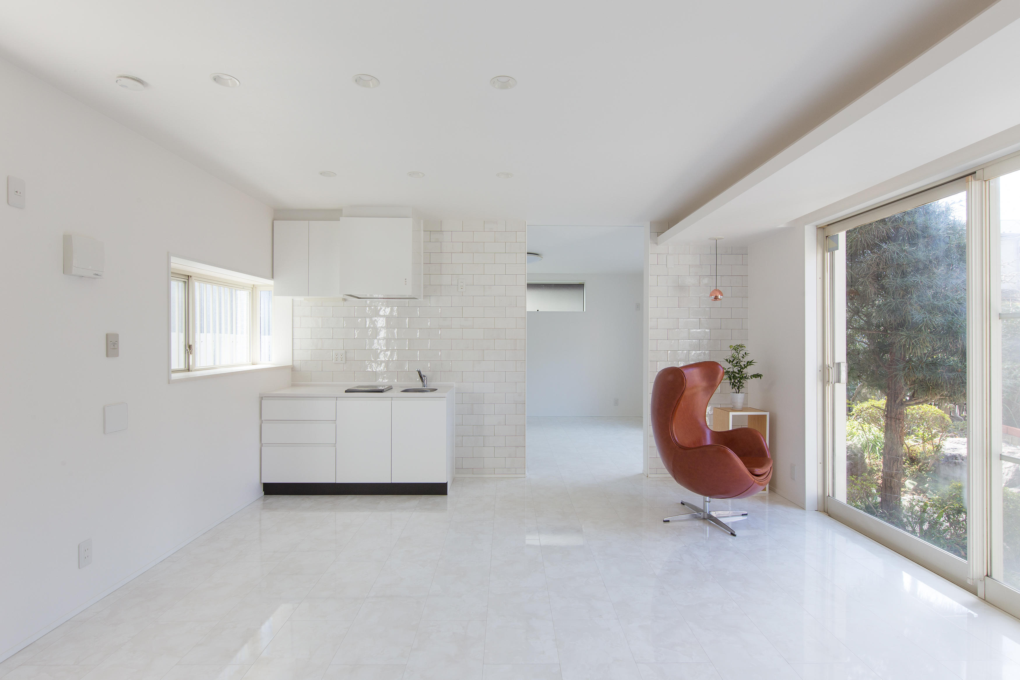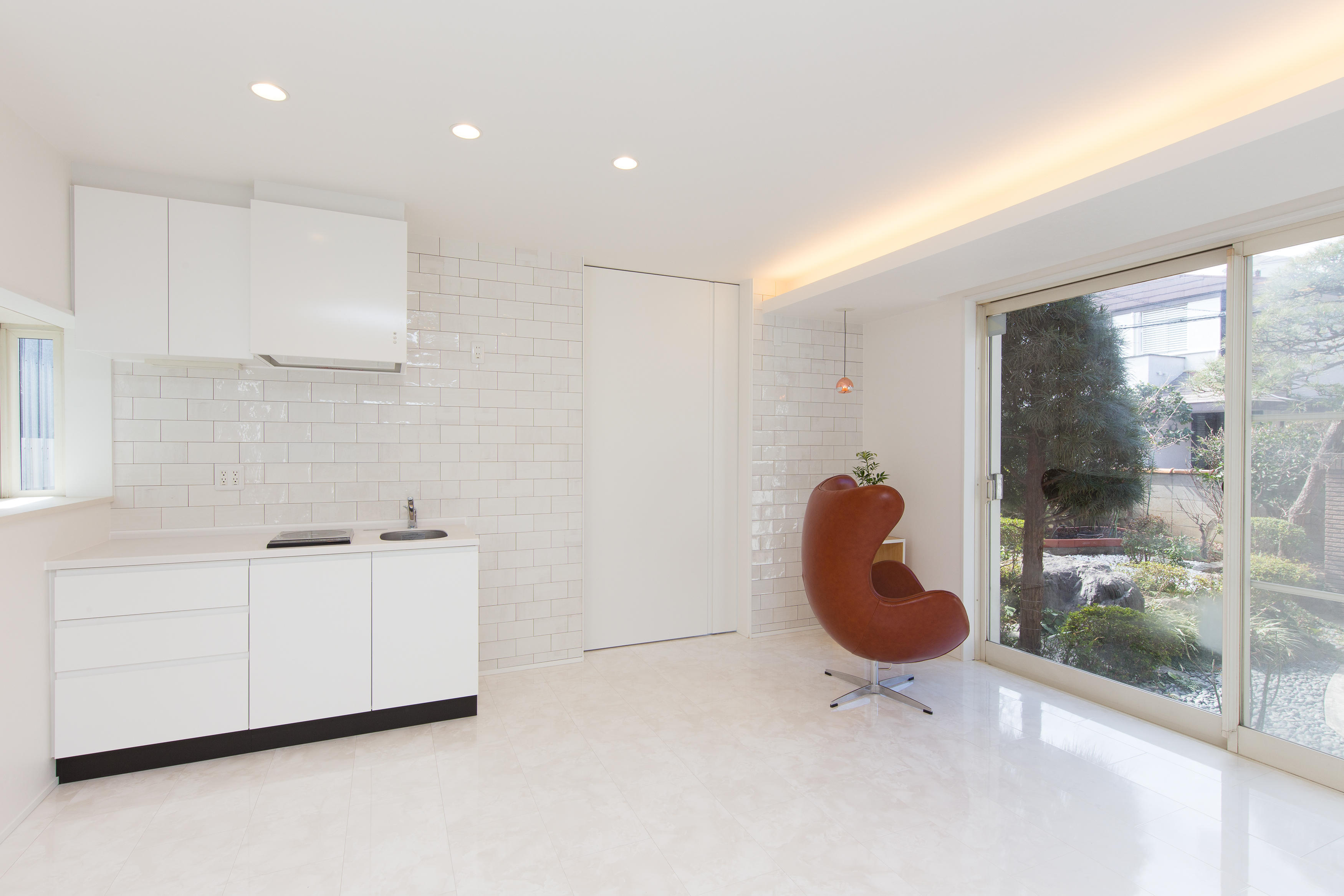 お湯を沸かす程度のミニキッチンが要望でした。ミニキッチンの面には、凹凸のある磁器質タイルを張りました。。
