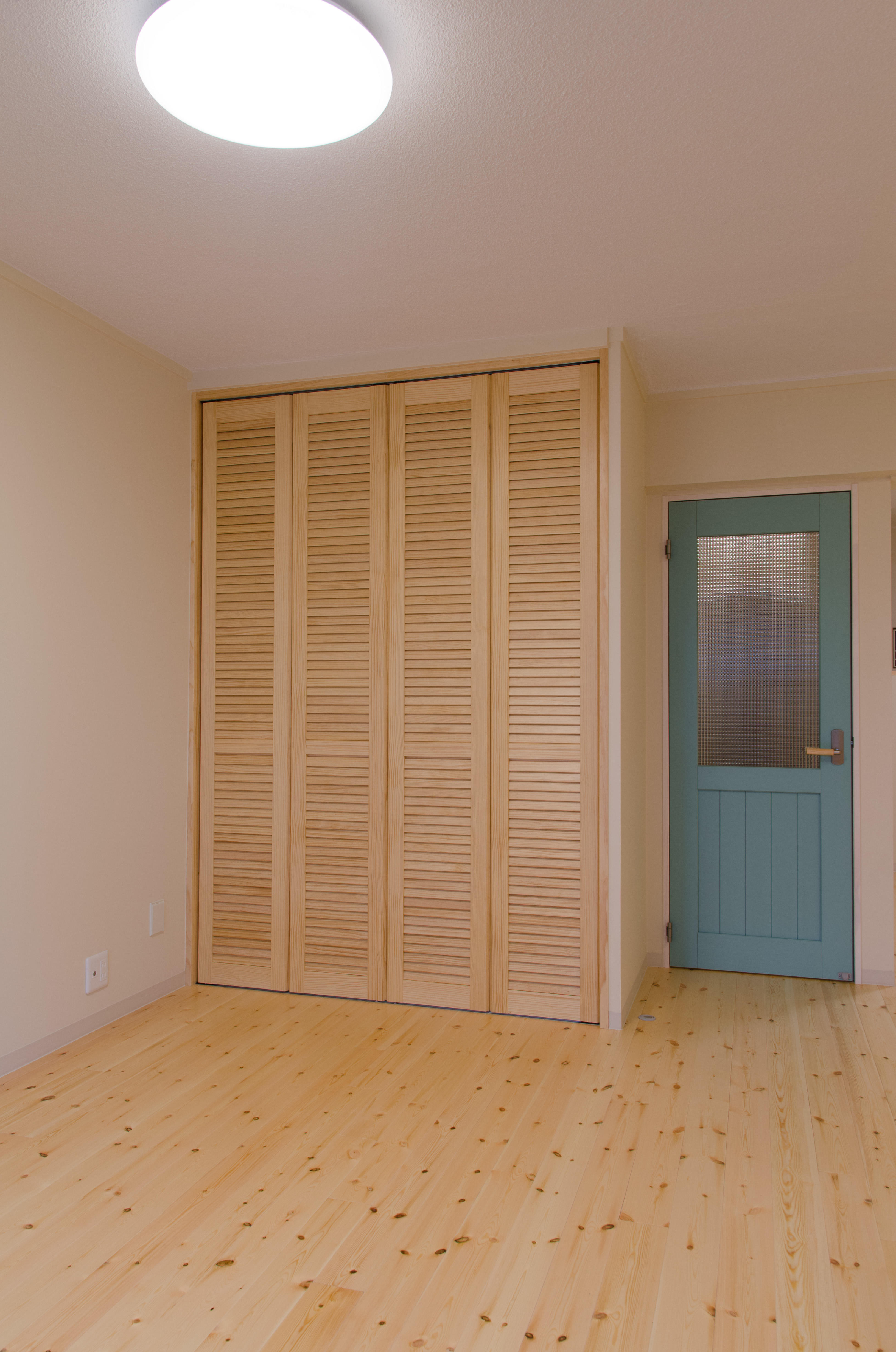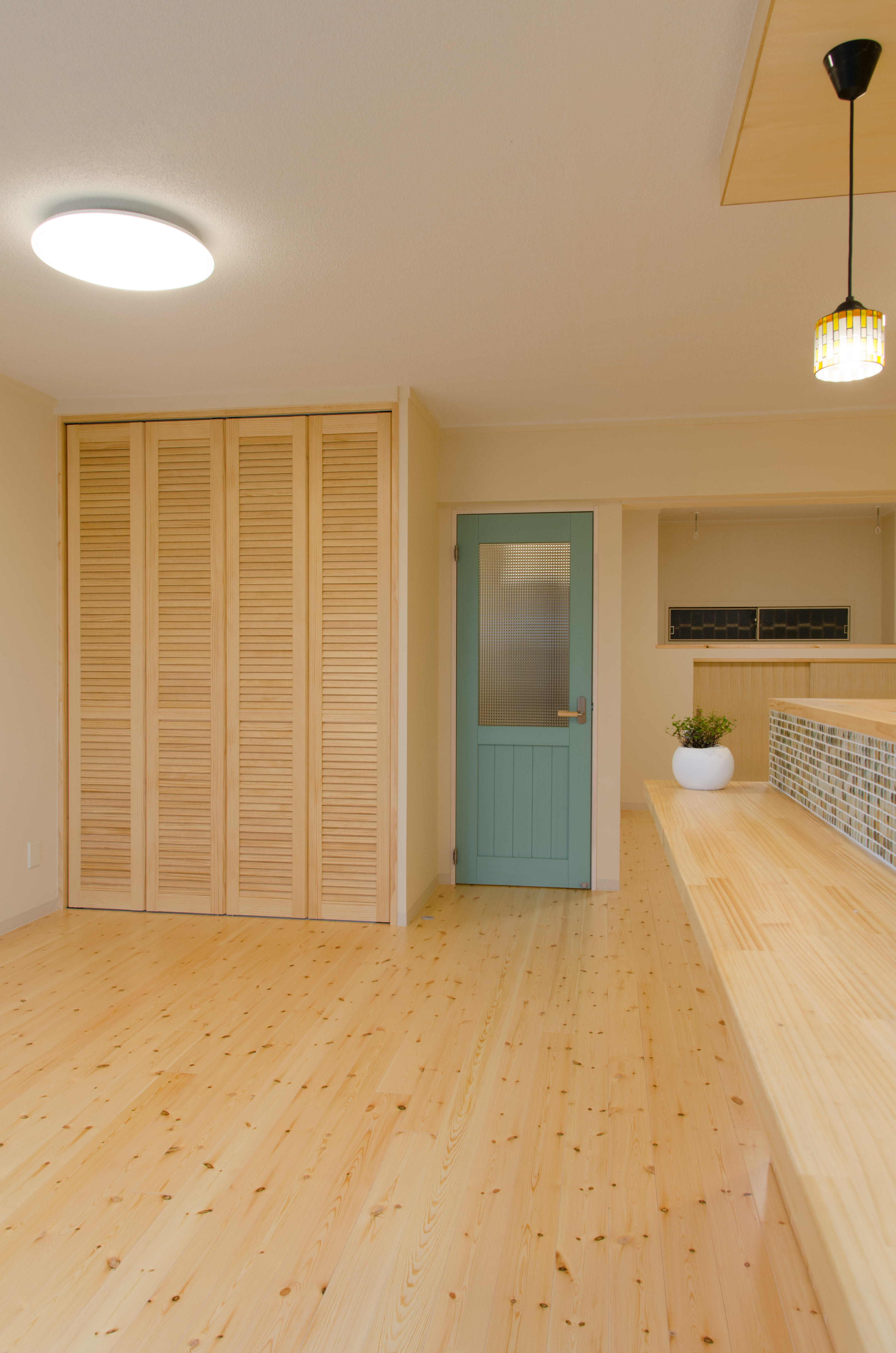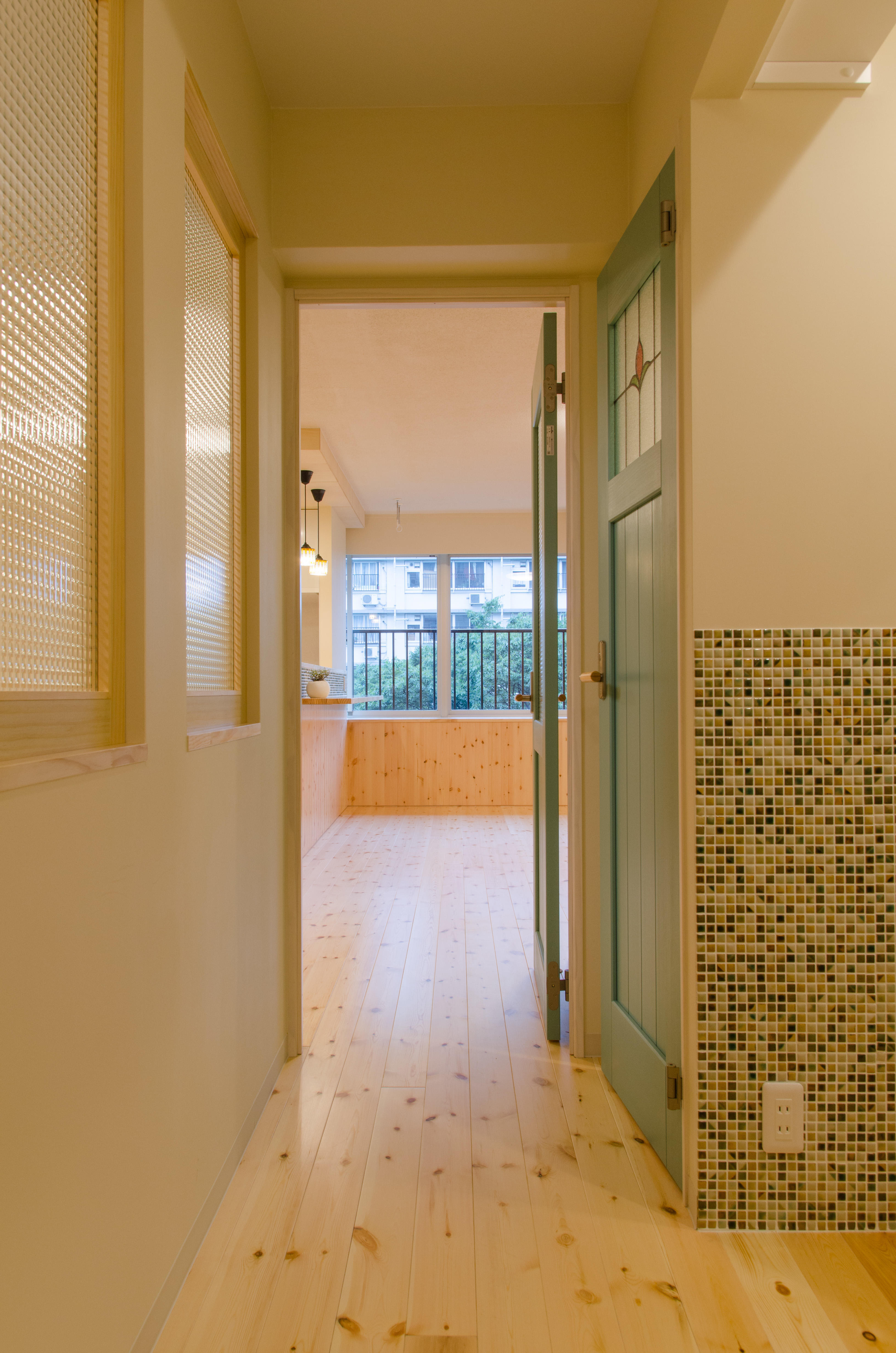 写真左に見えるガラスは 間仕切りに チェッカーガラスを入れて光を入れています。水色の建具は、トイレの入り口になります。建具のガラスはステンドグラスを入れました。