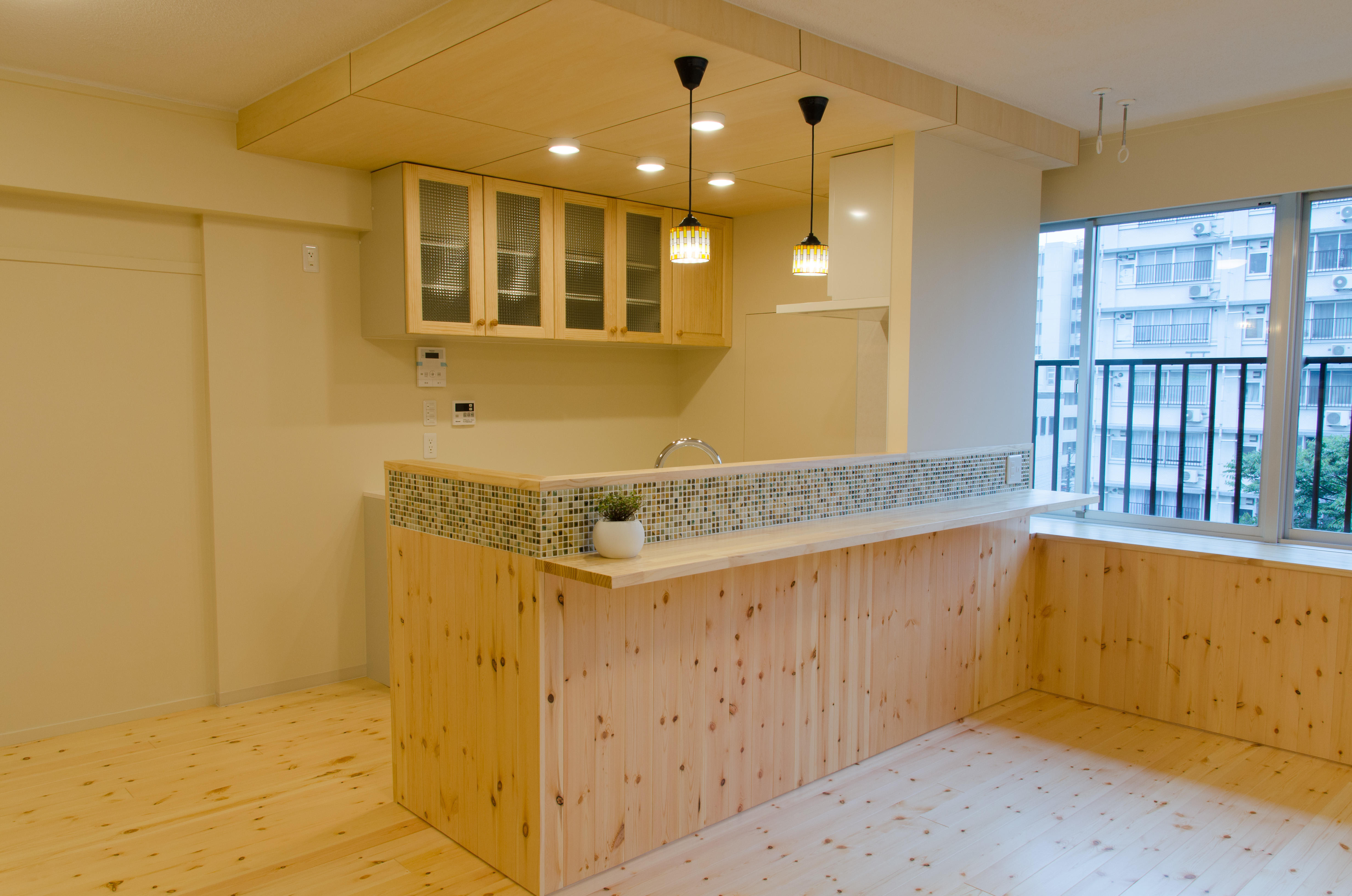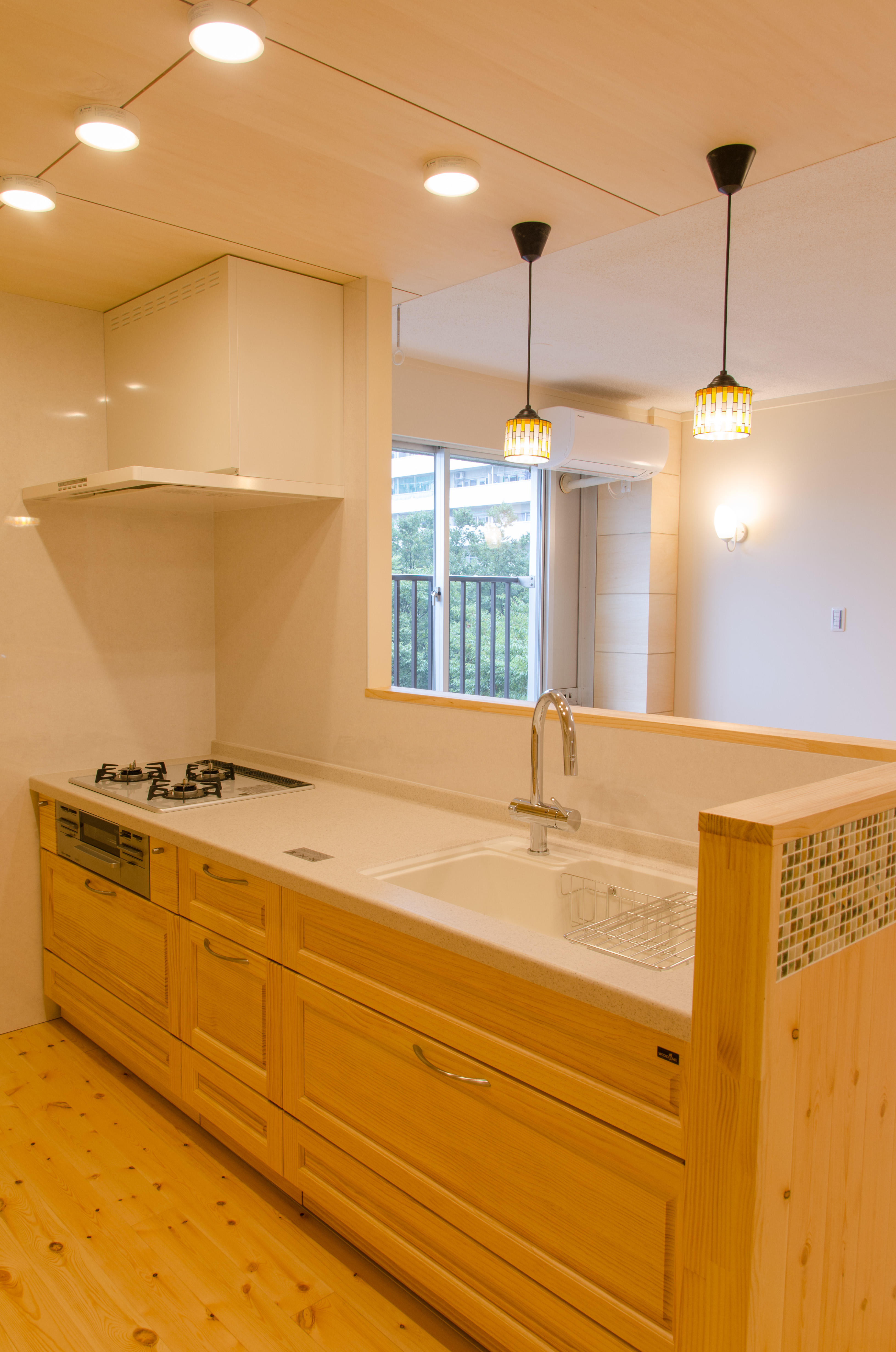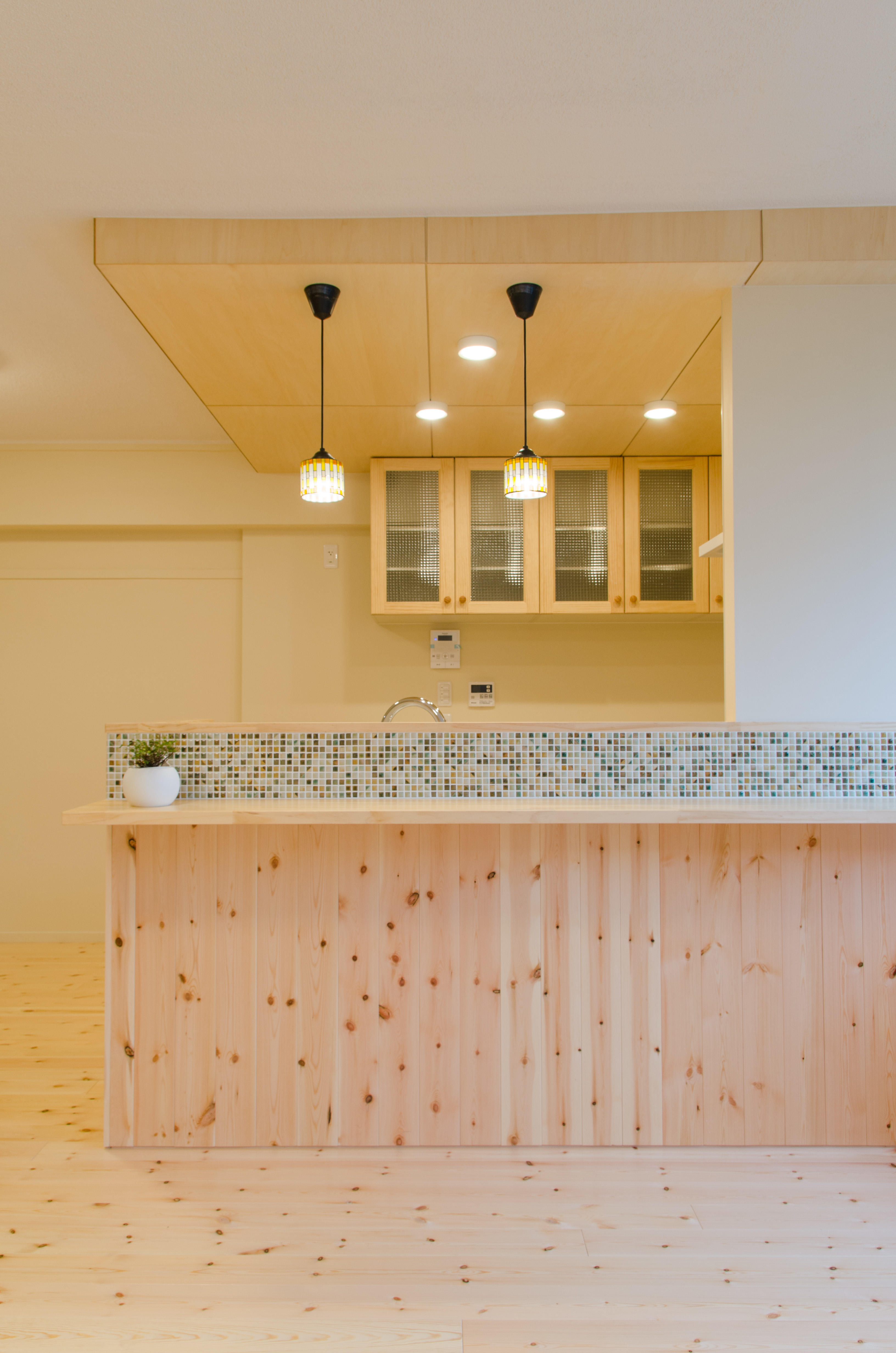 キッチンの天井は一部下げて、仕上げ材はシナ材を張り リビングとの高さの違いを付けて コードペンダントを付け 「いい感じ」に仕上がりました。システムキッチンは既製品の無垢材の扉仕様になっています。