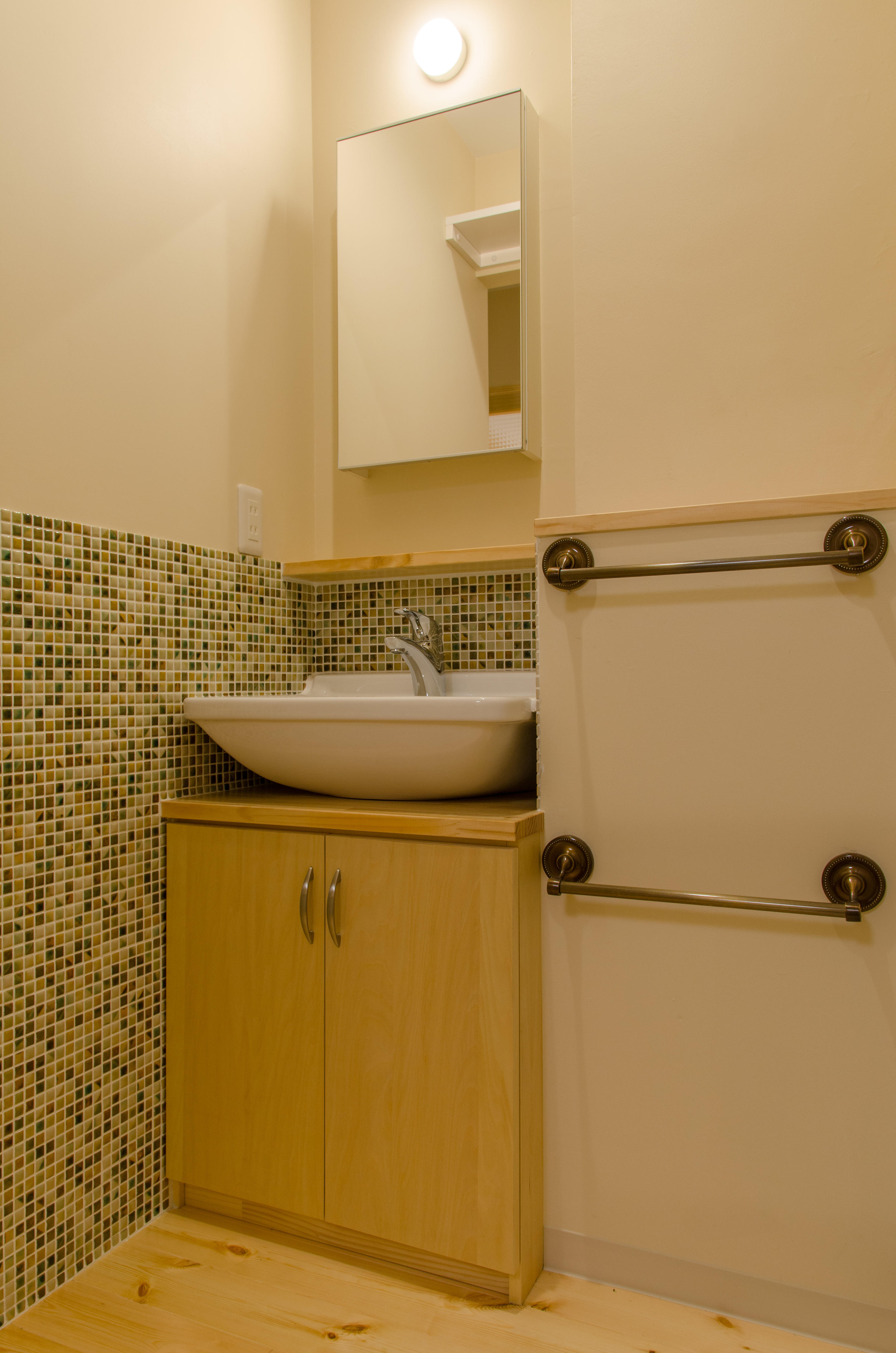 洗面化粧台は 製作しました。腰壁にはモザイクタイルを張りました。