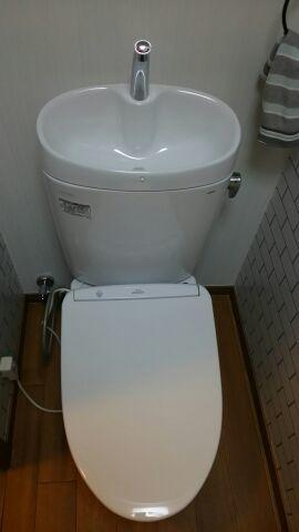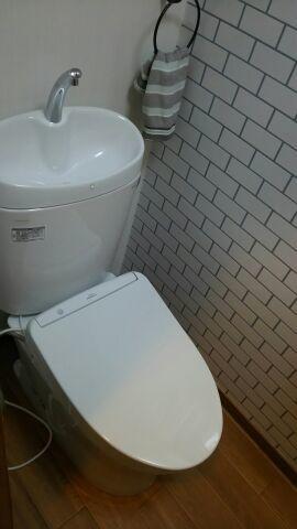 和式(汽車便)から洋式トイレへ。床CF・壁はアクセントクロスで仕上げました。段差も解消し快適です。