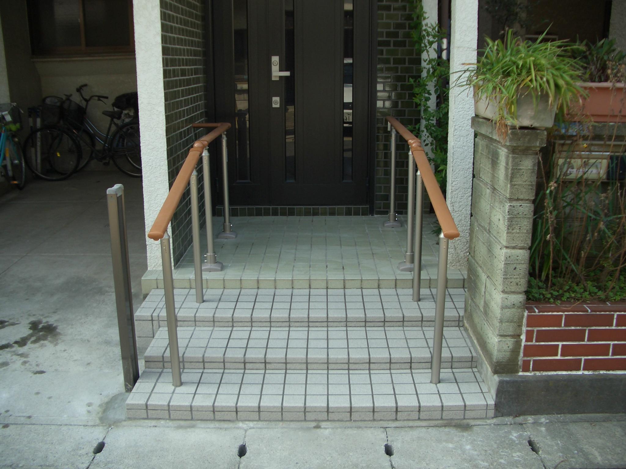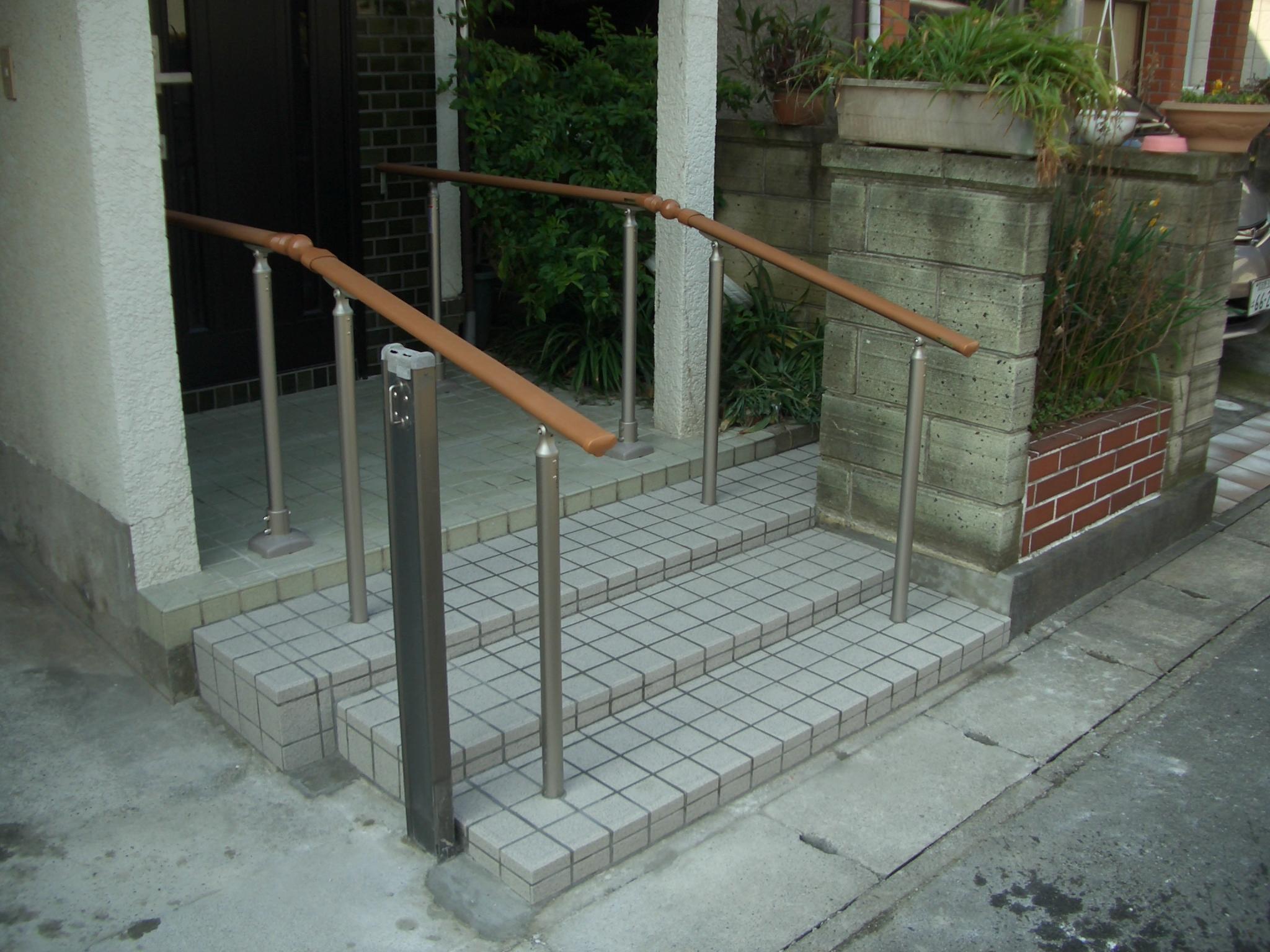 玄関までのアプローチに手すりを付けたいと相談を受けた物件になります。既存のブロックを壊して両側に手すりを付け、通路はスロープにするには距離が短すぎたため、段数を増やして高さを低くする提案をしました。