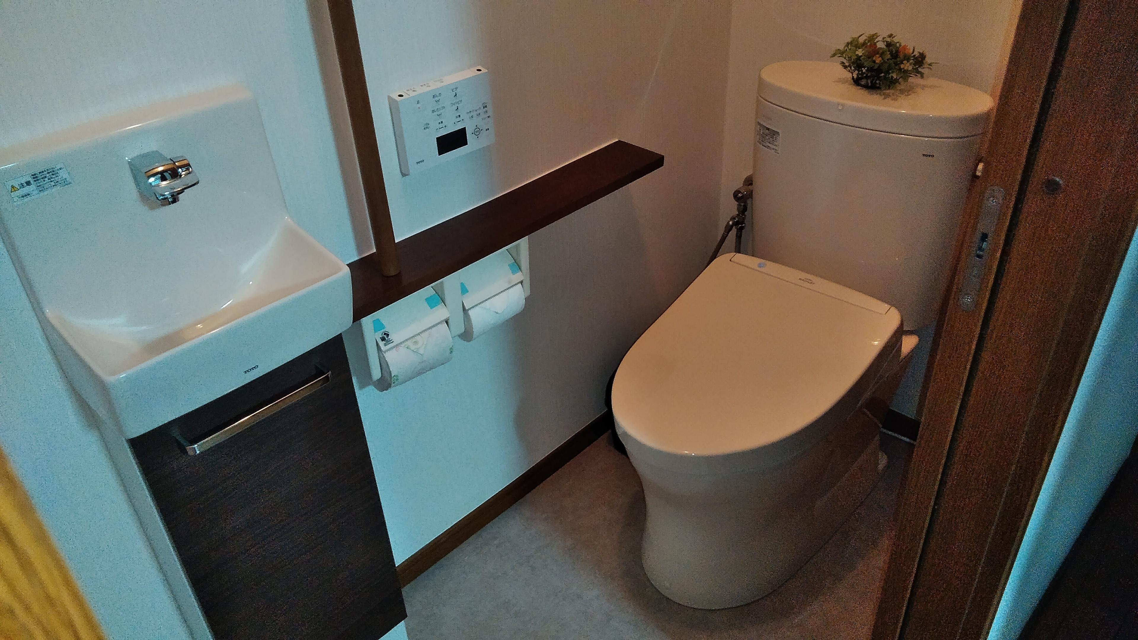 腰を悪くしてしまった奥様のためにご主人様 と考慮いたしまして、手洗いをタンク付きから入口の近くに設置致しました。