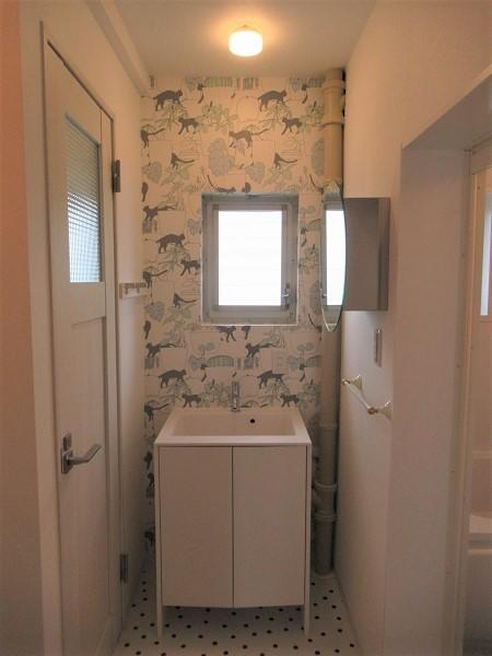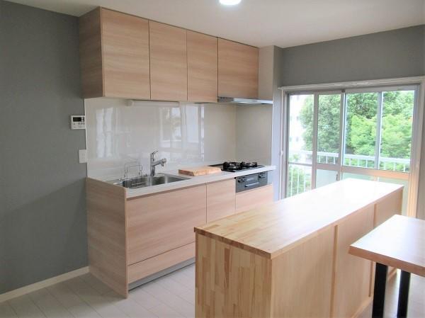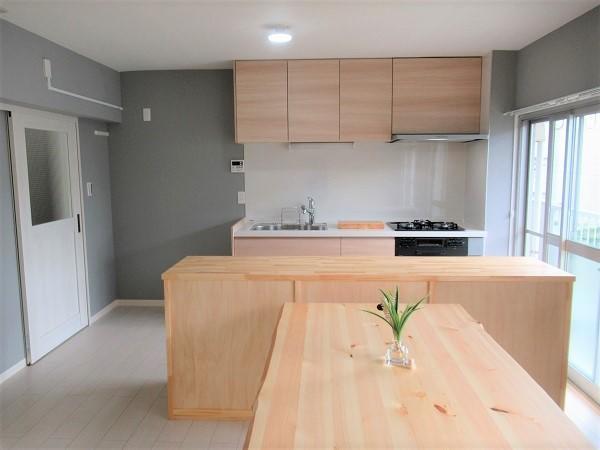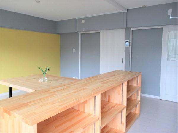 お施主様が入居予定の集合住宅をリフォーム。 鮮やかなイエロー、グレー、エネルギッシュなイエローのドットなど、お施主様の好きな色や柄をふんだんに取り入れた個性的で明るいお部屋に。キッチン前の木のインテリアは職人の造作。お部屋の温かみをより一層引き立たせています。